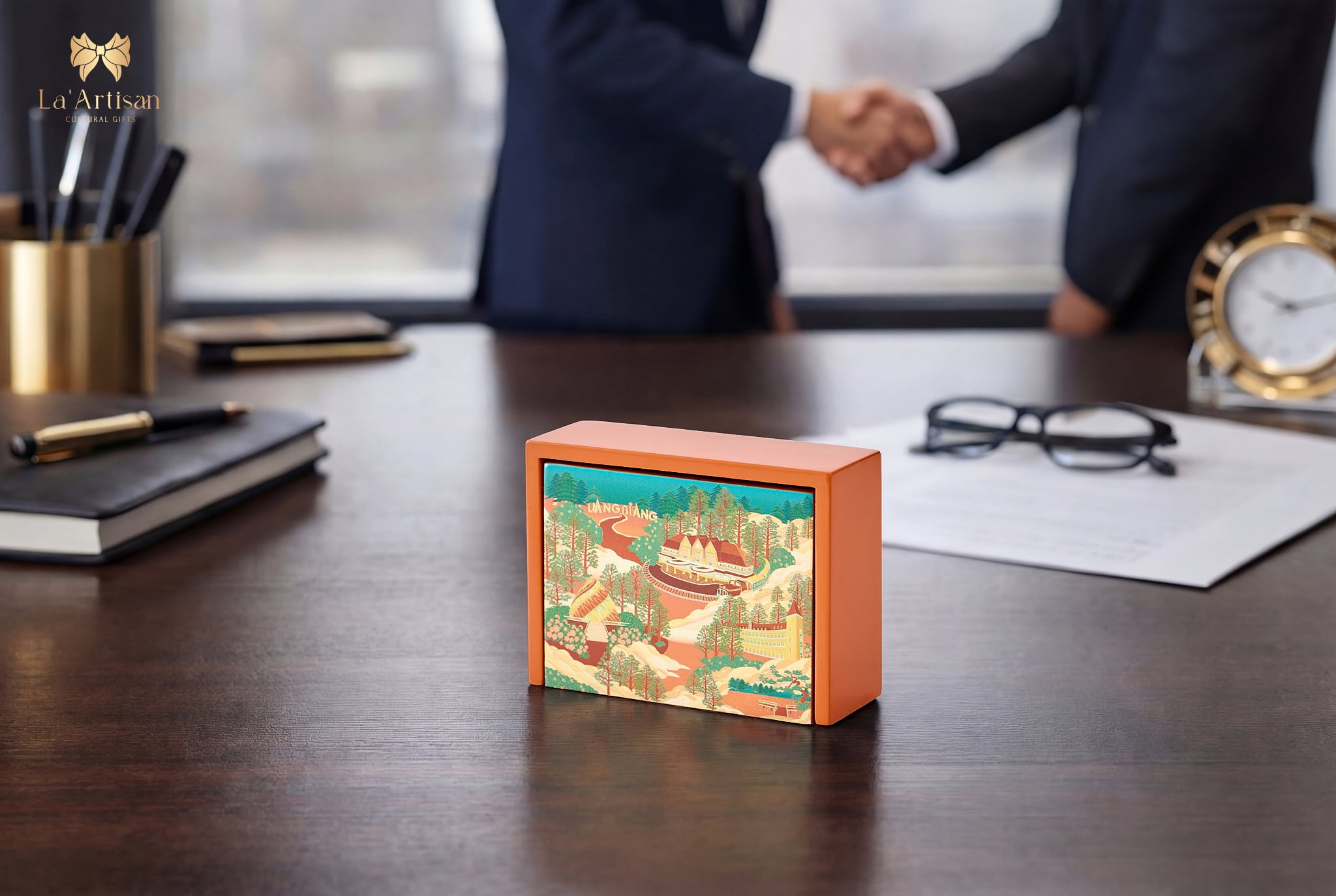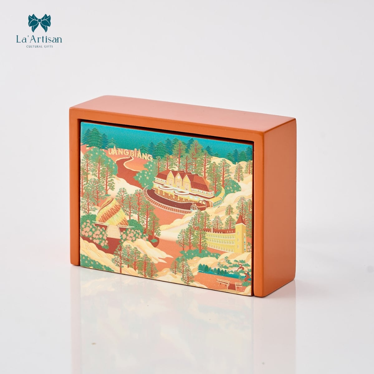 Hộp card visit họa tiết Ga Đà Lạt không chỉ đơn thuần là vật dụng lưu giữ danh thiếp mà còn là món quà mang đậm dấu ấn văn hóa – thích hợp dành tặng đối tác, bạn bè hoặc những ai yêu mến vẻ đẹp trầm mặc của thành phố ngàn hoa.