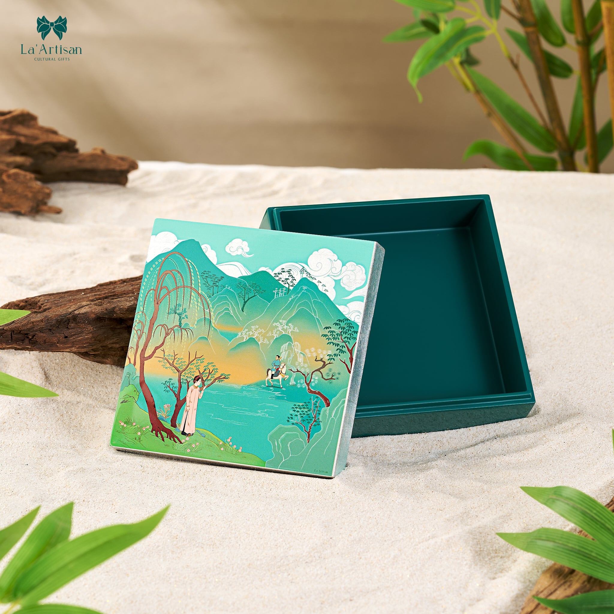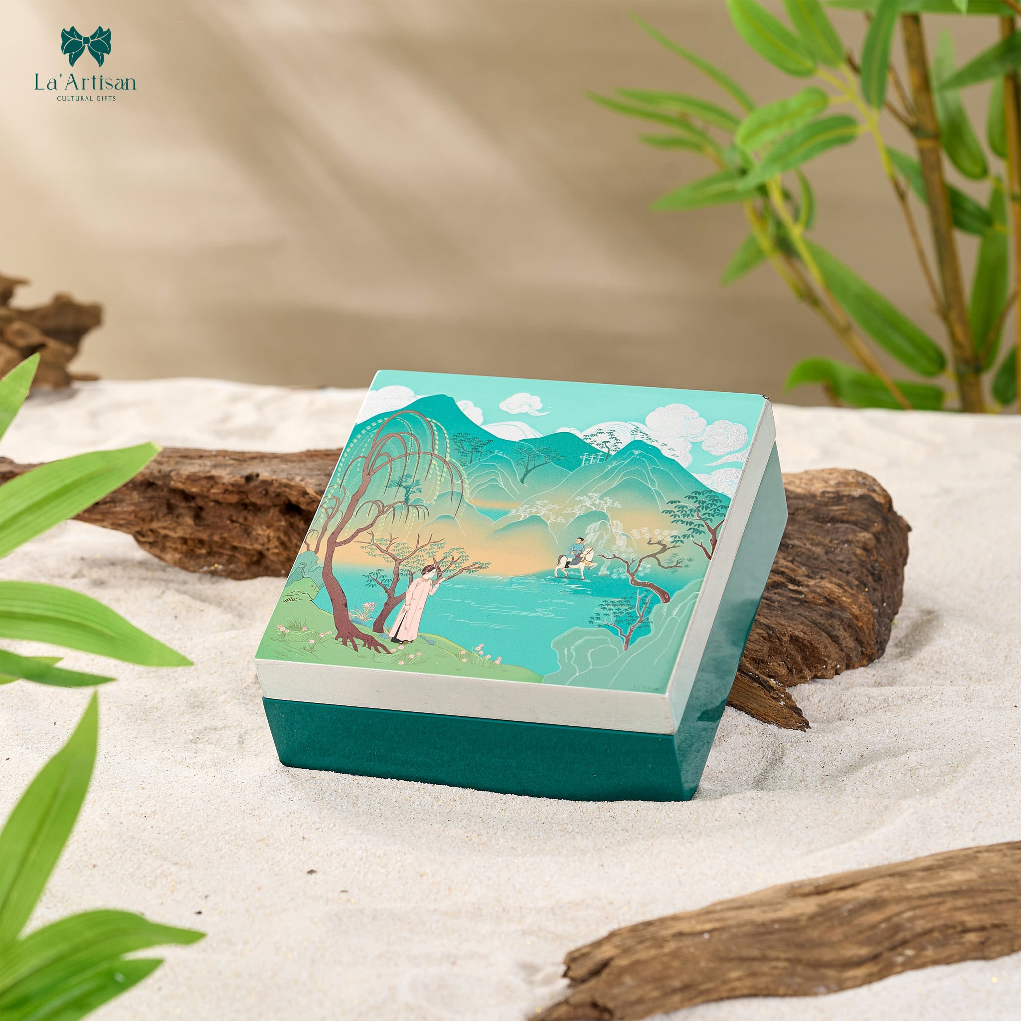Sử dụng sắc xanh non làm màu chủ đạo, hộp sơn mài khơi gợi nỗi u tịch và sầu bi của người vợ chốn khuê phòng khi ngóng trông chồng nơi sa trường khốc liệt. Trung tâm thiết kế là hình ảnh người thiếu phụ áo trắng đứng bên dòng nước xanh biếc, ánh mắt dõi theo bóng người chồng đang dần khuất trên lưng ngựa giữa nền trời và núi biếc xa xăm.