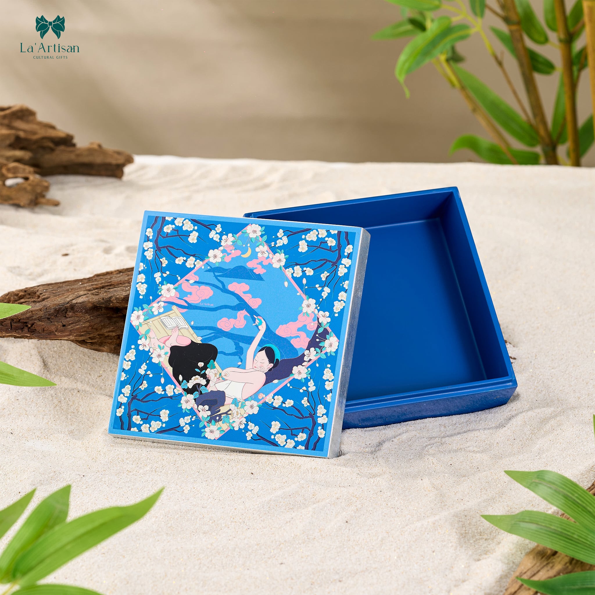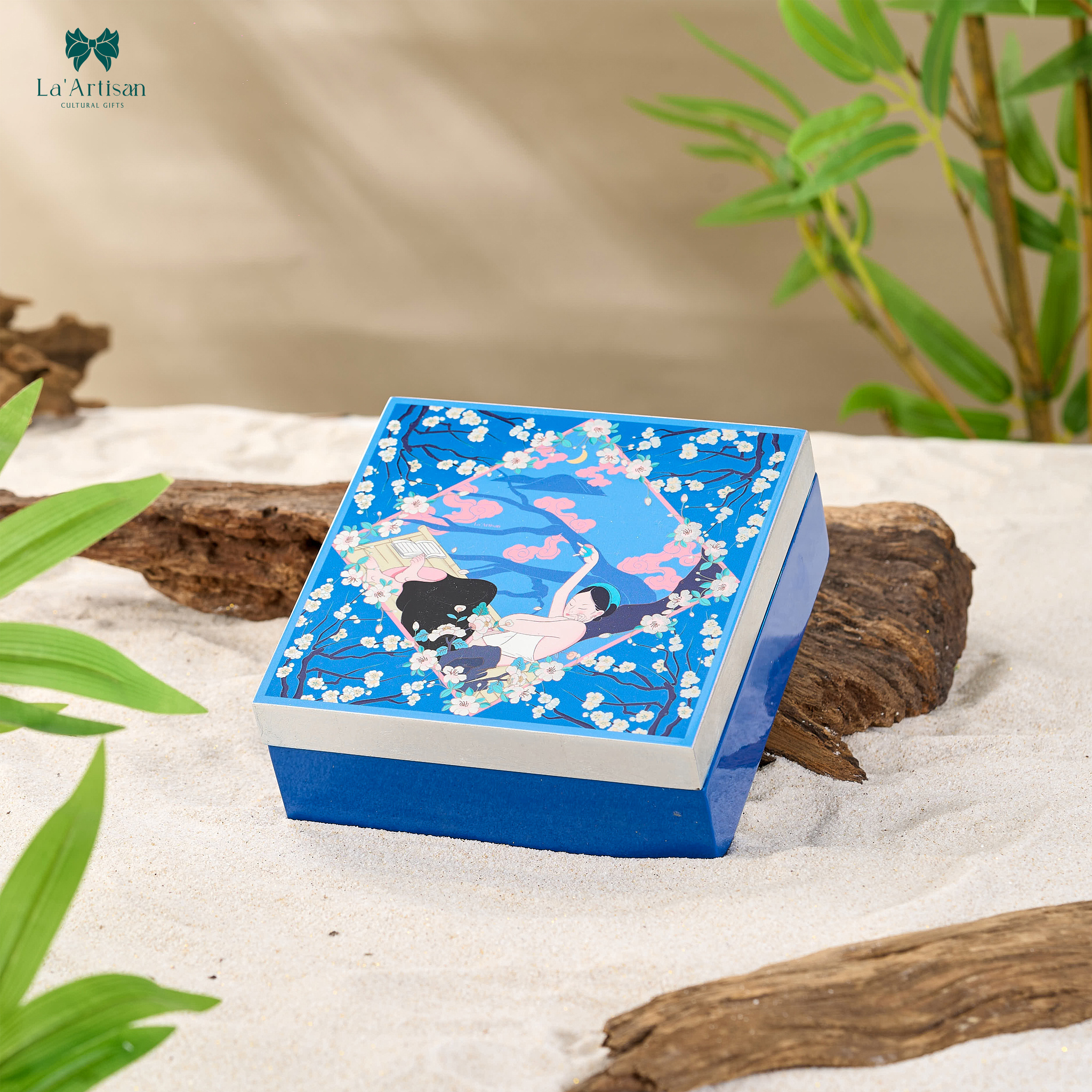 Được chế tác từ chất liệu sơn mài truyền thống với bề mặt phủ bóng óng ánh, chiếc hộp cao cấp mang sắc xanh lam trầm thanh lịch làm nền chủ đạo. Trên nền ấy, những cành hoa mơ trắng – biểu tượng của vẻ đẹp thanh tân và khí chất tự do – nở rộ như một khu vườn đang thì thầm lời thơ.