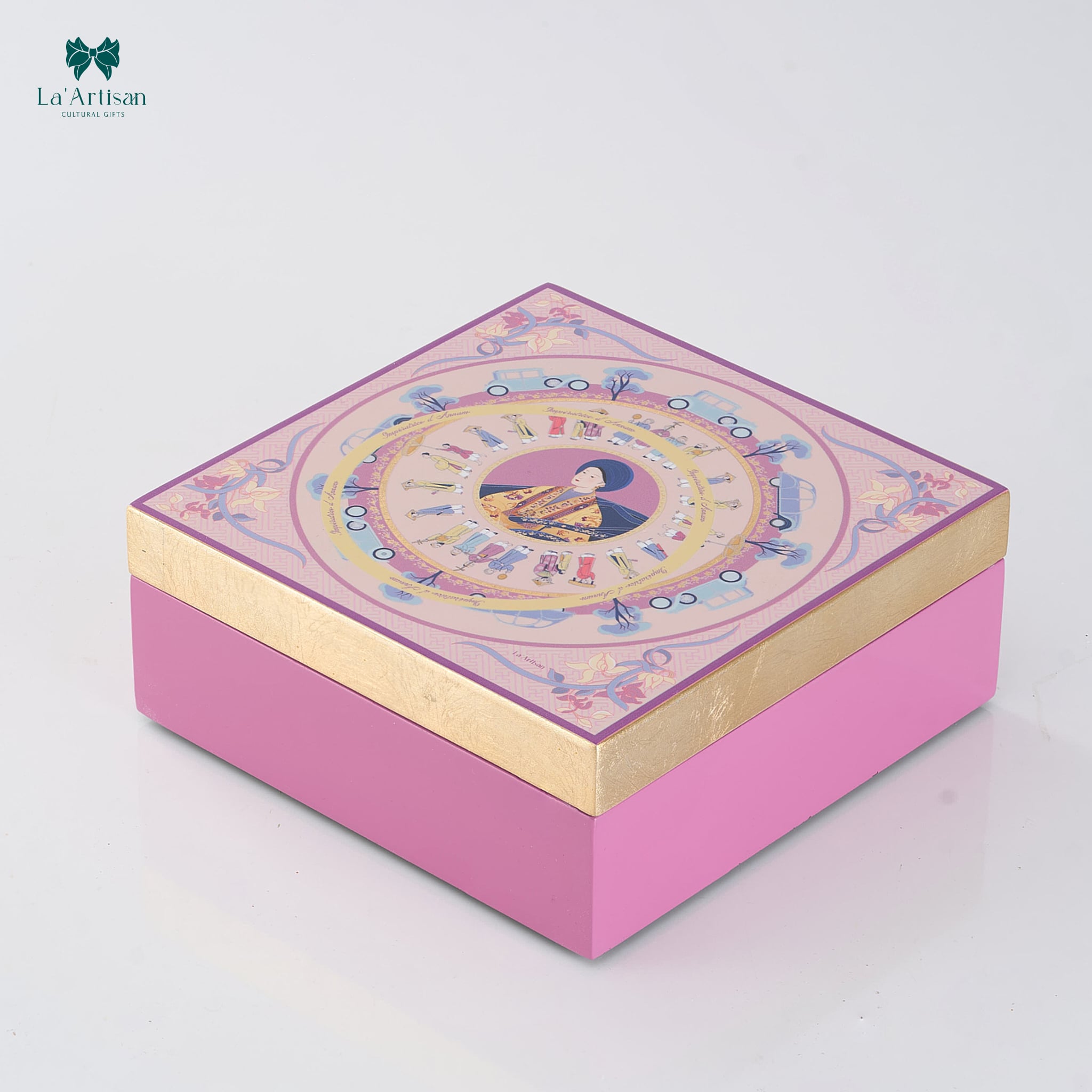 Với đường nét uyển chuyển, bề mặt hộp được xử lý theo cấu trúc vòng tròn liên hoàn, tạo cảm giác cổ điển nhưng không nặng nề. Các họa tiết như dây leo, hoa mai và nét viết tay góp phần mang đến sự mềm mại và gần gũi, làm nổi bật tinh thần nữ tính một cách kín đáo, không phô trương.