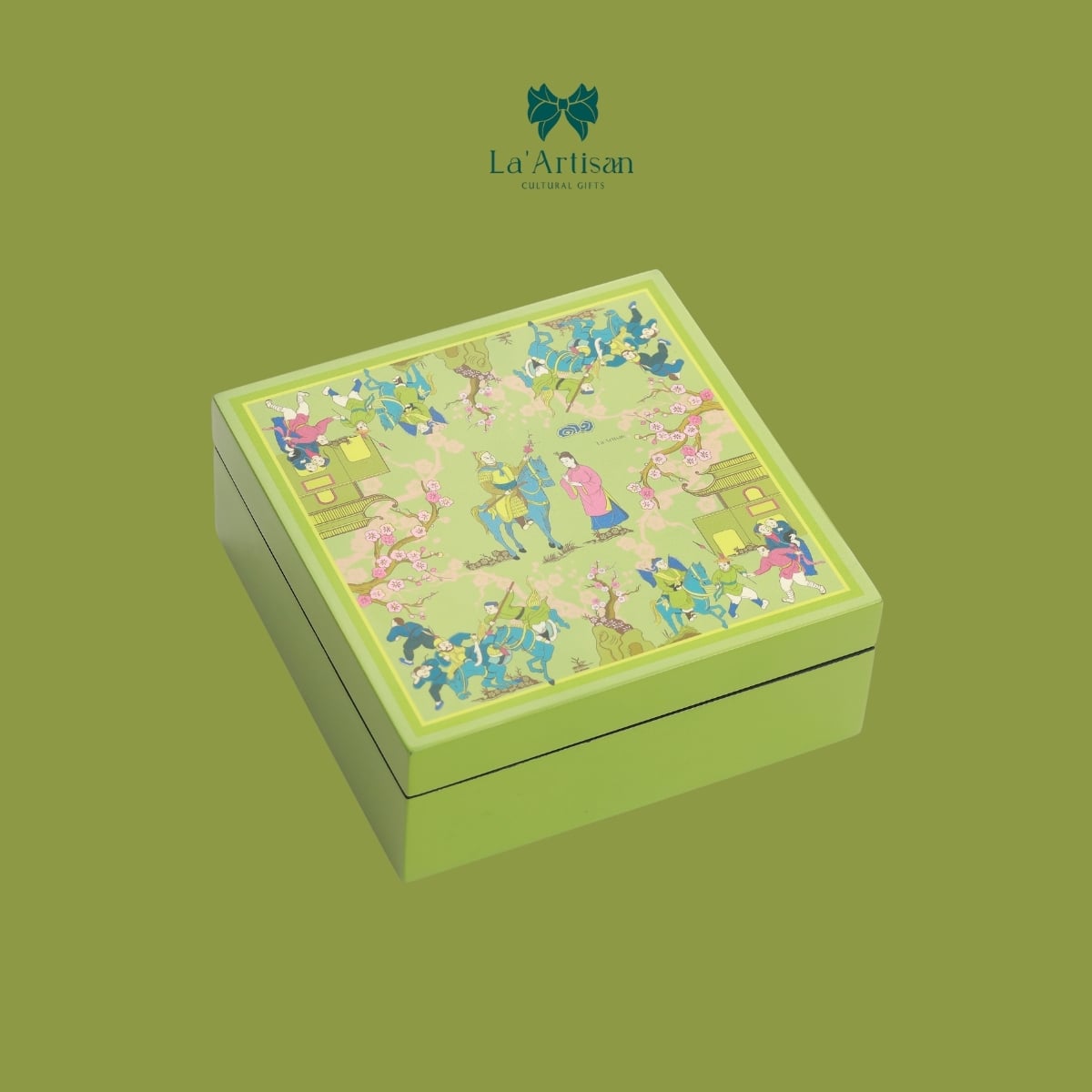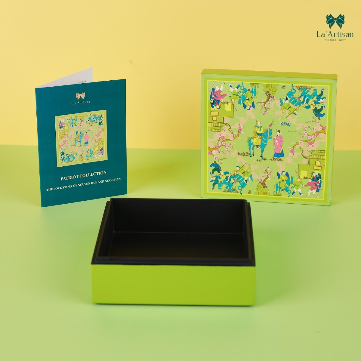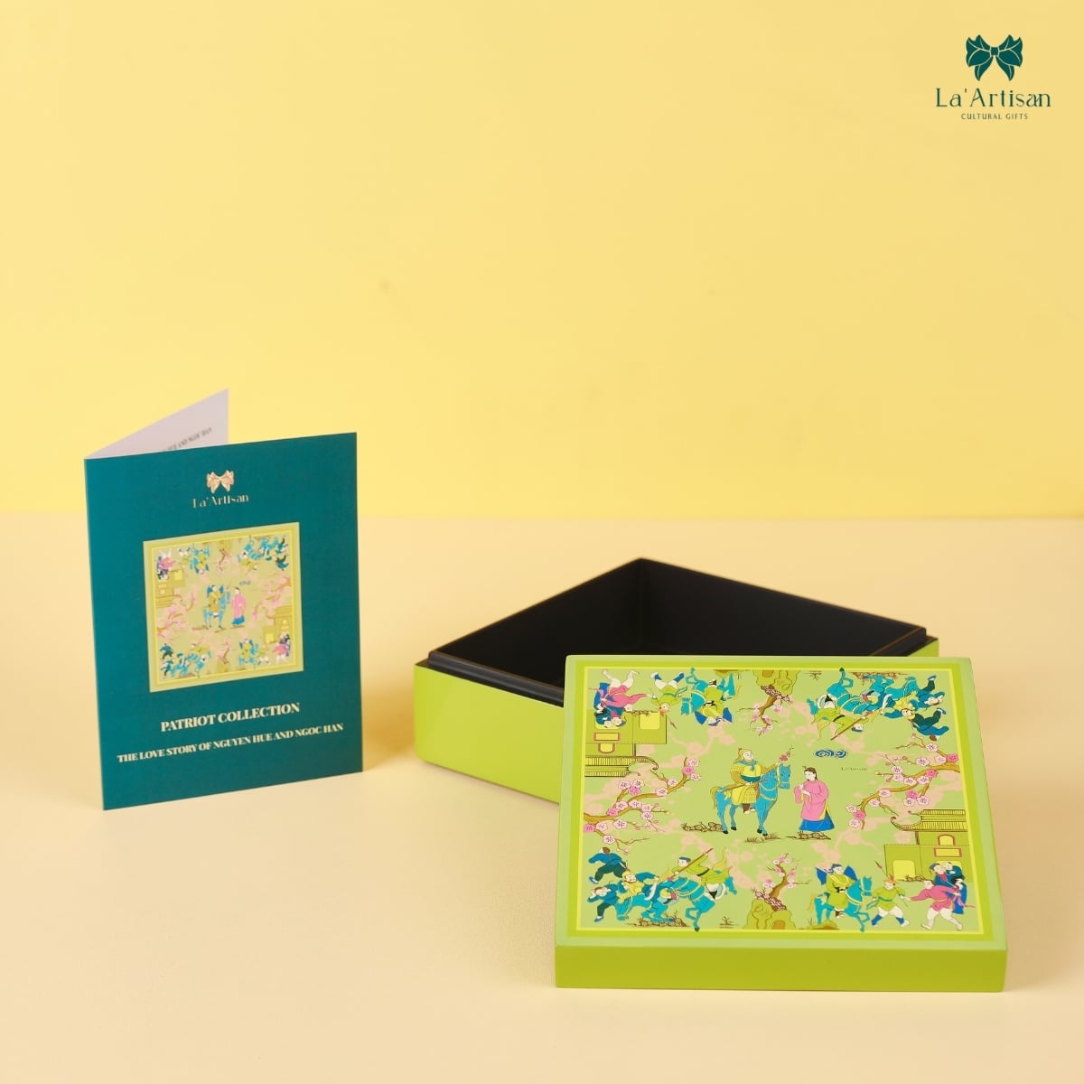 Chiếc hộp sơn mài hoạ tiết cao cấp được chế tác thủ công và mang sắc xanh non của xuân Thăng Long - nơi khởi đầu mối duyên tiền định. Với trung tâm thiết kế là hình ảnh Nguyễn Huệ cưỡi ngựa chiến trở về, được công chúa Ngọc Hân đón giữa hoa đào rộ nở, chiếc hộp sơn mài hoạ tiết gửi gắm thông điệp về sự tái sinh và hòa hợp, cũng như một tình yêu đương độ viên mãn, vẹn tròn.