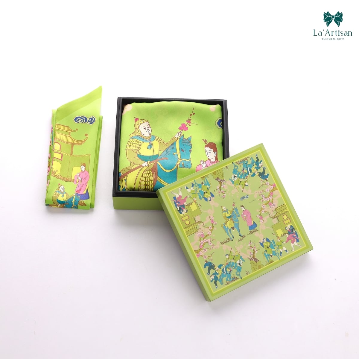 Bên cạnh đó, các mảng cảnh xung quanh mô phỏng lối minh họa dân gian: quân sĩ ca khúc khải hoàn, những đóa hoa tỉ mỉ, mái đình cổ kính cũng góp phần khiến chiếc khăn hoạ tiết như một bản giao hưởng thị giác, thể hiện trọn vẹn vẻ đẹp lịch sử và mỹ học phương Đông.