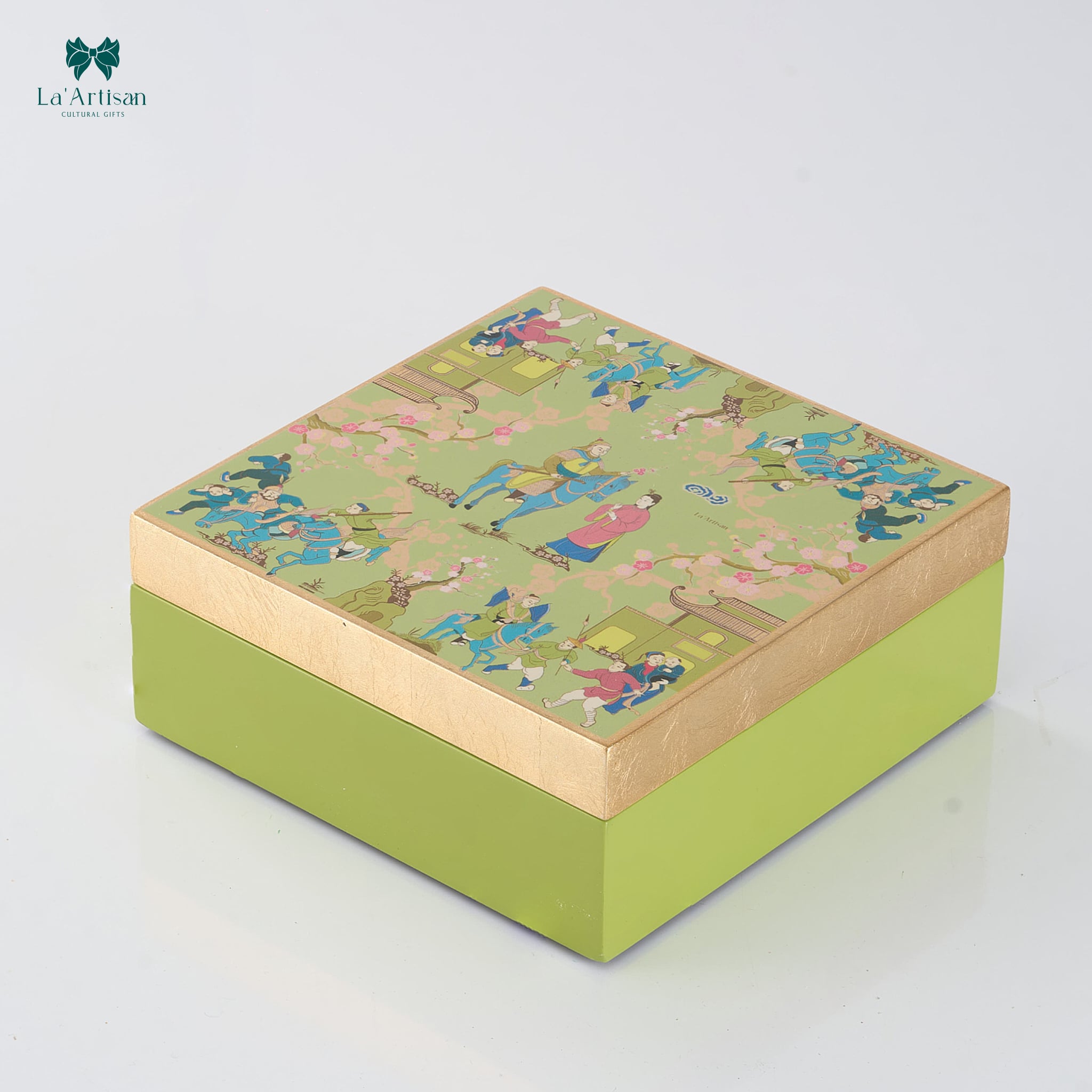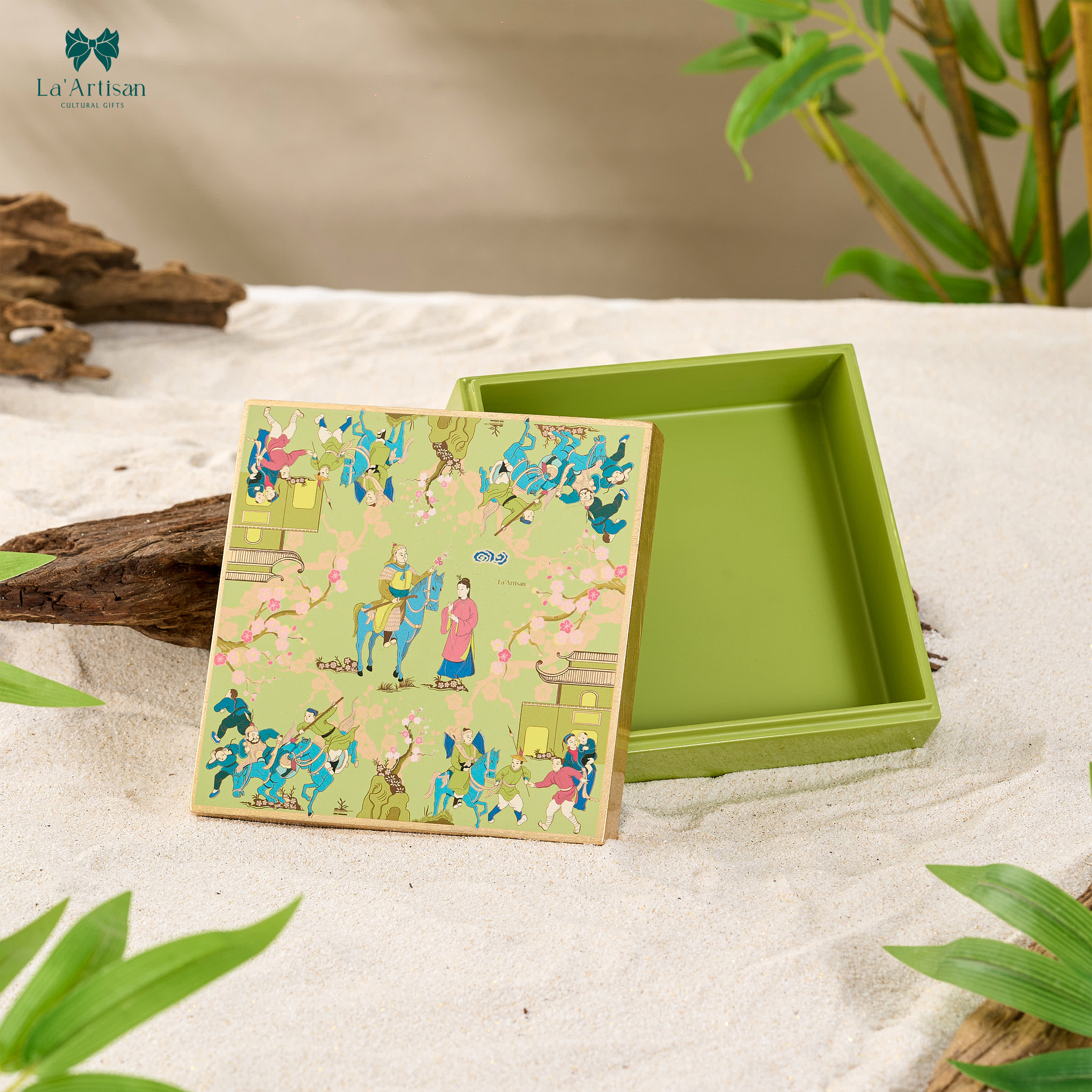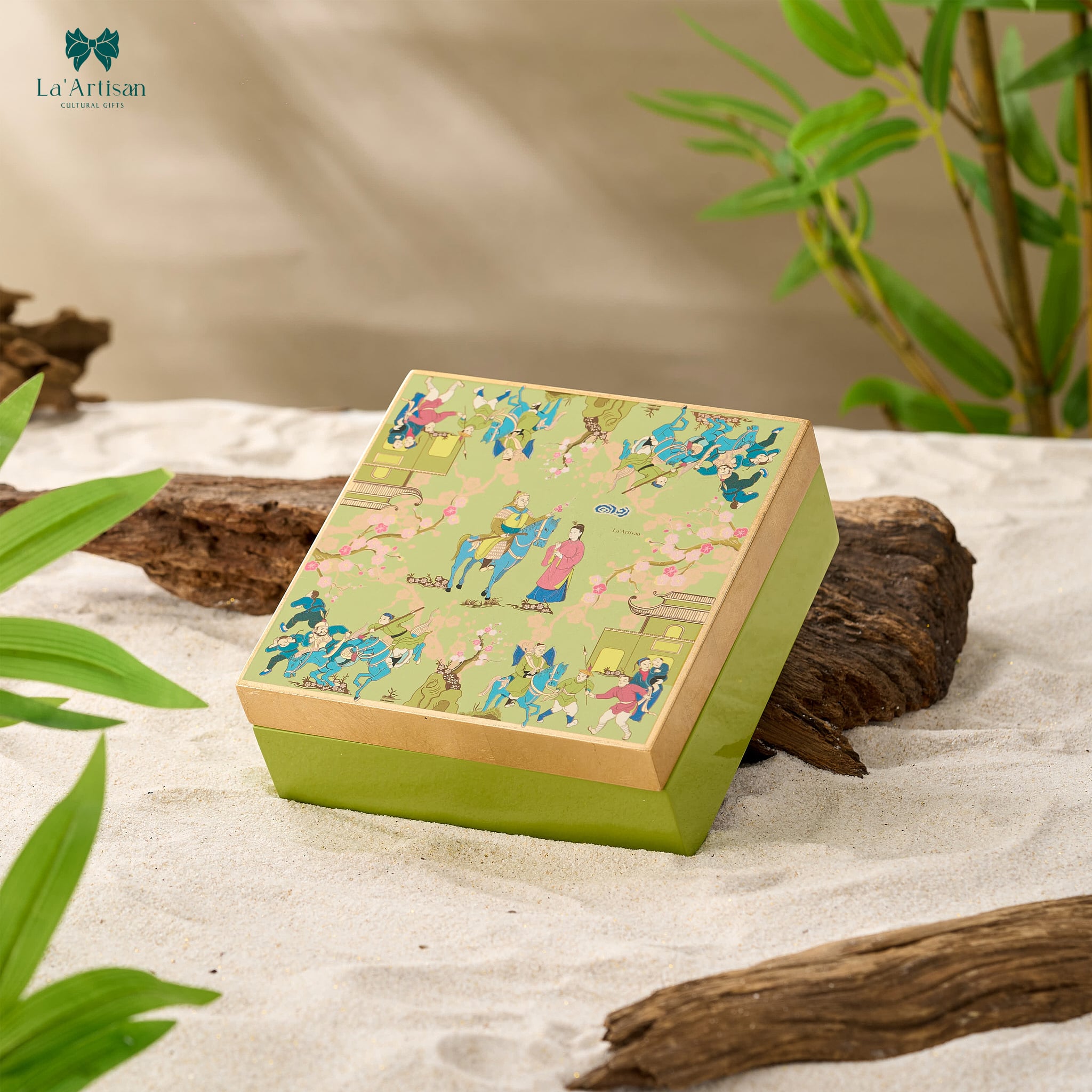 Hộp sơn mài cao cấp được chế tác thủ công với nhiều lớp sơn phủ và mài công phu, mang sắc xanh non của xuân Thăng Long nơi khởi đầu mối duyên tiền định. Trung tâm thiết kế là hình ảnh Nguyễn Huệ cưỡi chiến mã khải hoàn trở về, được công chúa Ngọc Hân đón giữa rừng hoa đào rộ nở. Bố cục ấy gửi gắm thông điệp về sự hòa hợp, tái sinh và một tình yêu đang độ viên mãn.