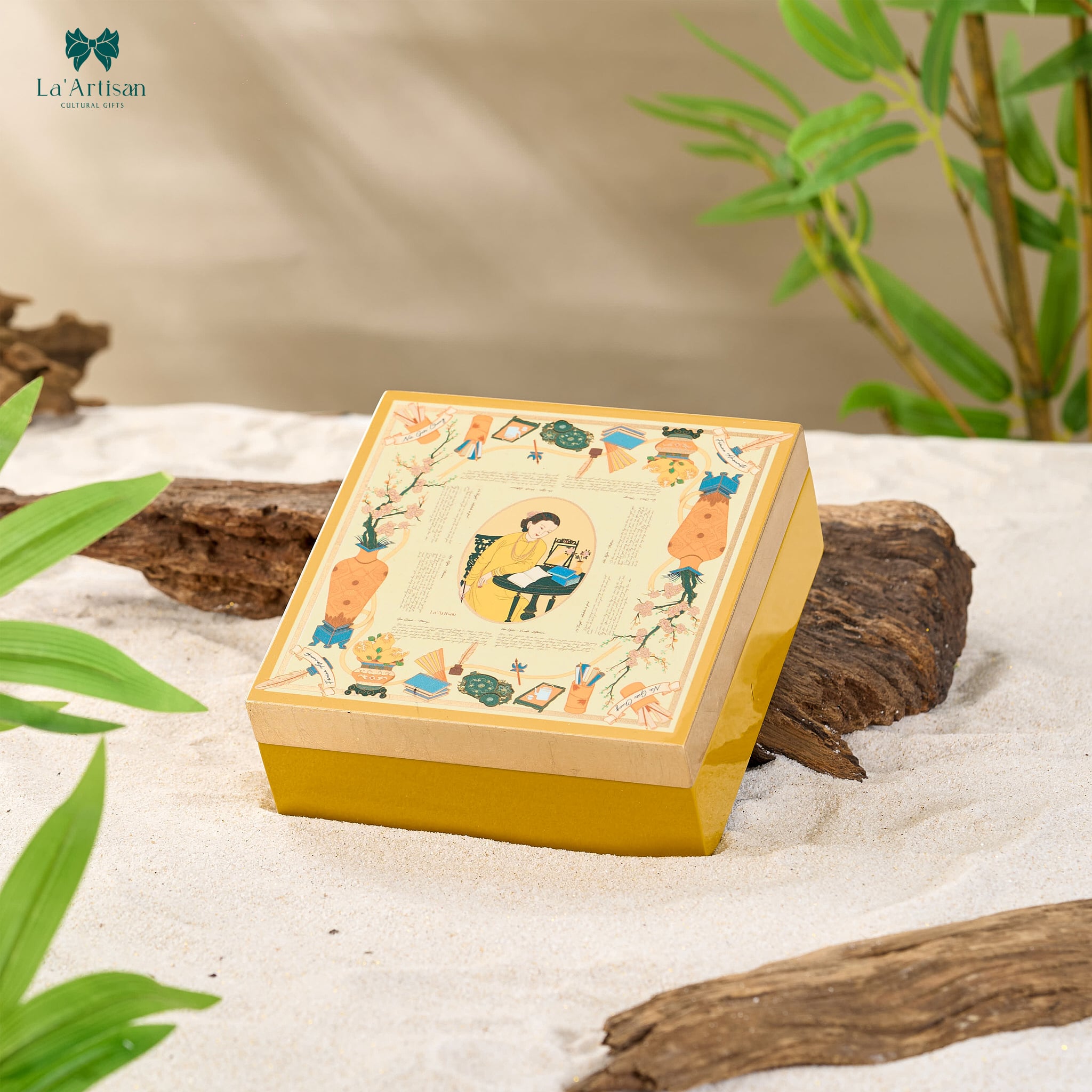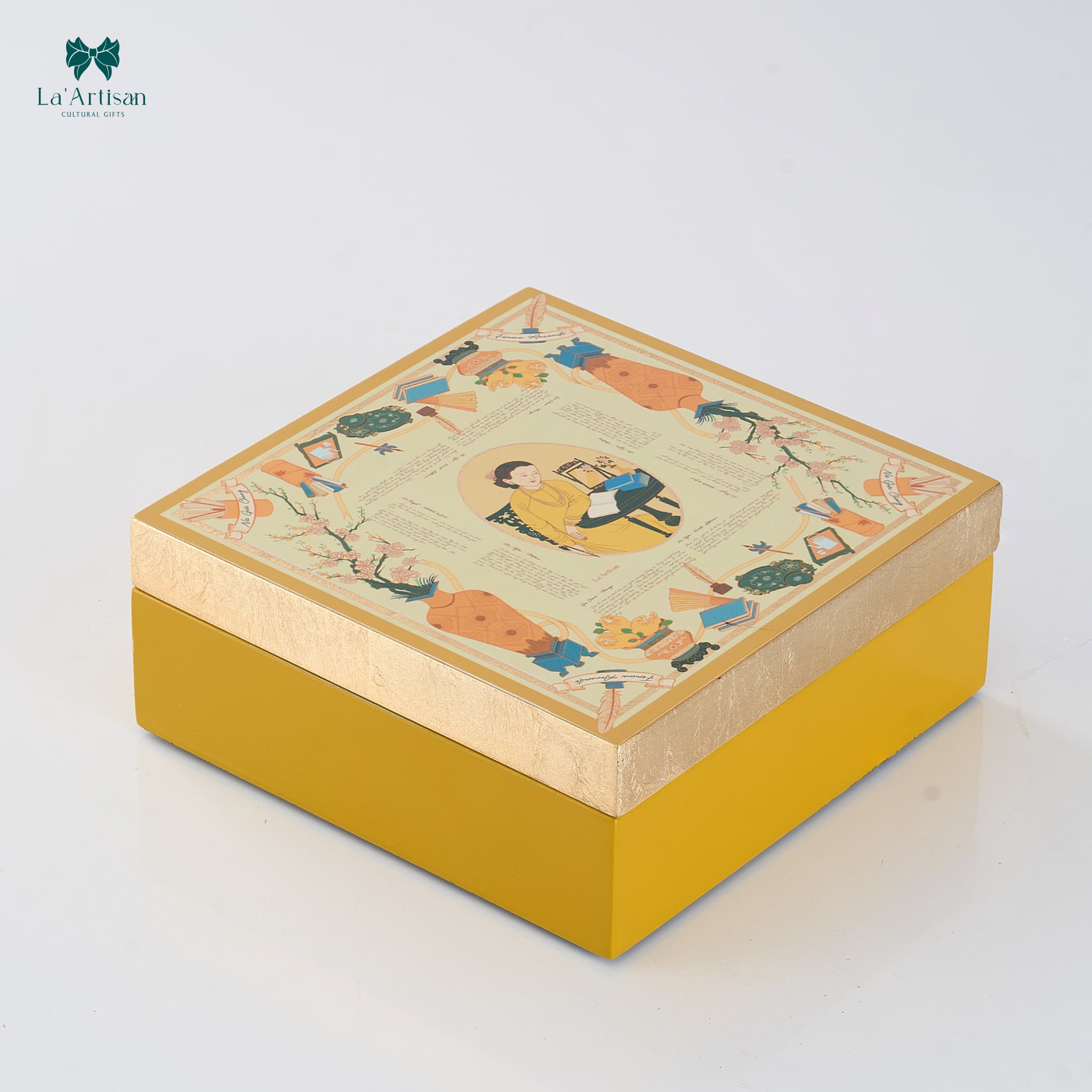 Hộp sơn mài nổi bật với gam màu vàng kem trang nhã làm nền chủ đạo, điểm xuyết bởi những hình ảnh tượng trưng cho tri thức và mỹ học truyền thống: sách bút, nghiên mực, quạt giấy, hoa mai nở rộ gợi không gian một thư phòng Đông Dương cổ điển và trang trọng. Các chi tiết được thể hiện bằng kỹ thuật sơn mài nhiều lớp, mài và đánh bóng thủ công, tạo chiều sâu ánh sắc và độ óng ánh sang trọng.