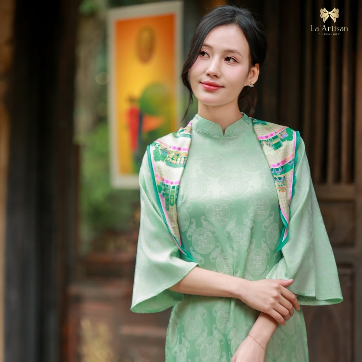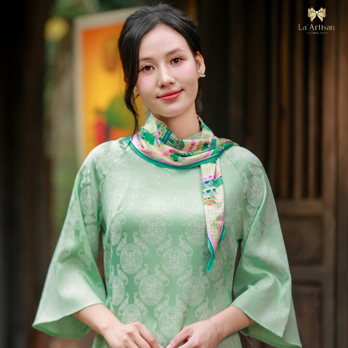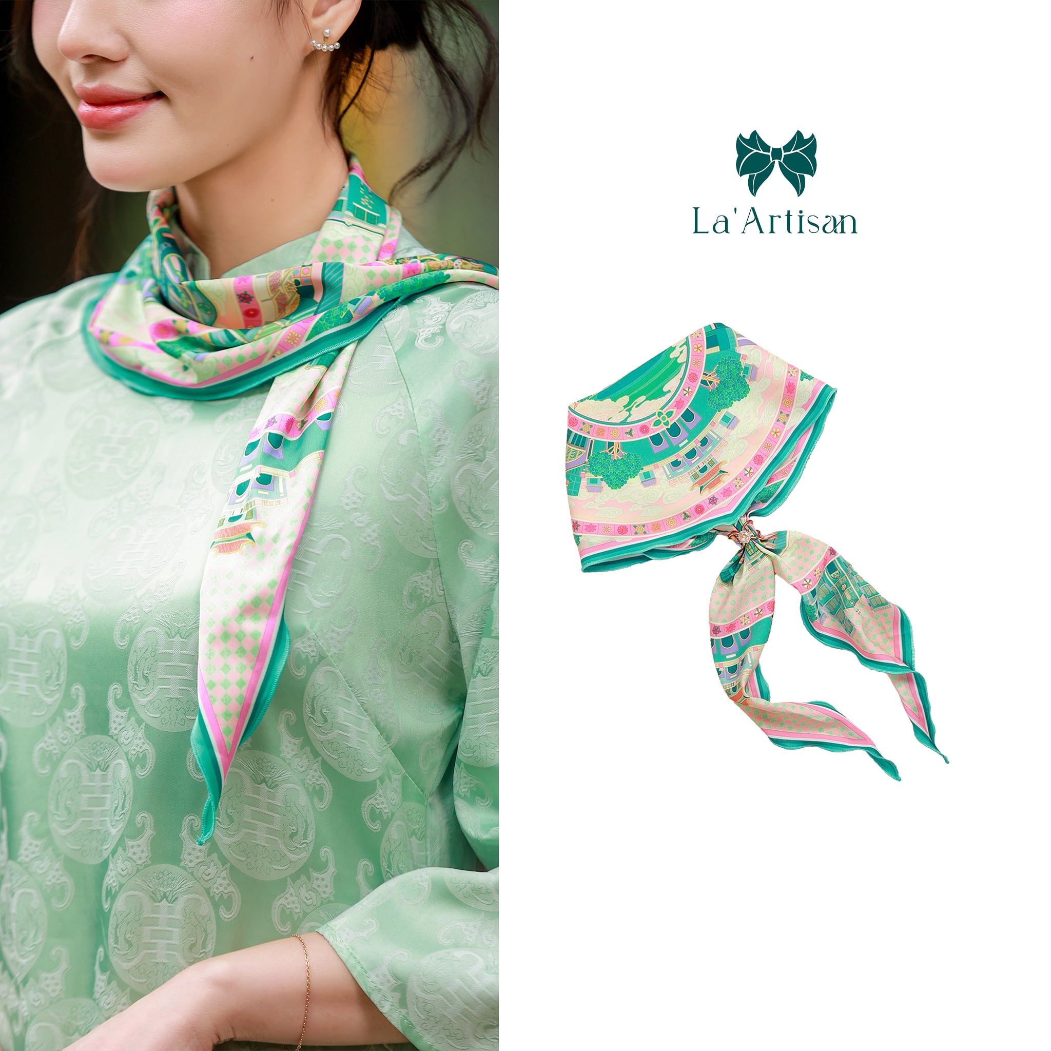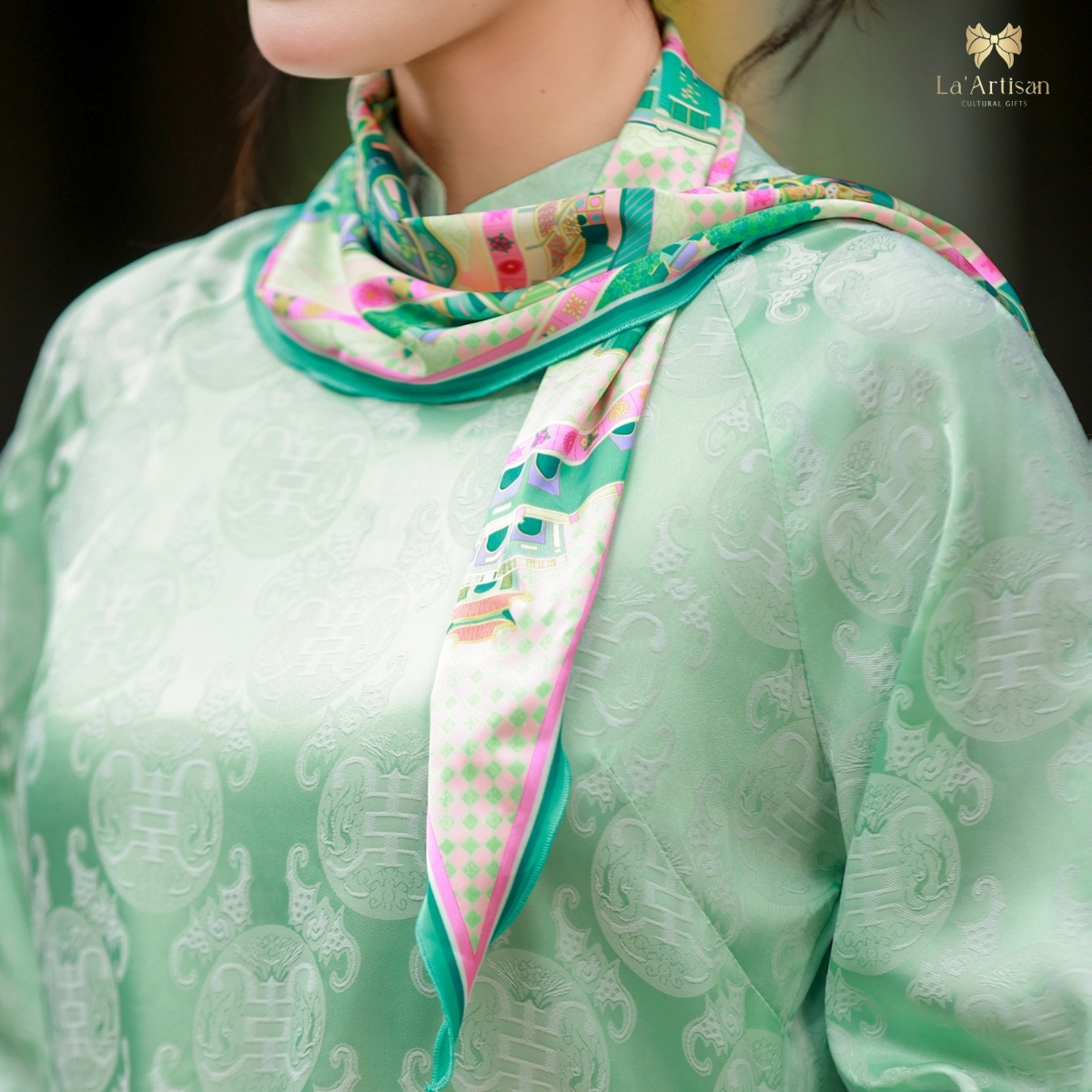 Chiếc khăn họa tiết Hà Nội được lấy cảm hứng từ những khoảnh khắc bình dị, đong đầy yêu thương và nhịp sống riêng có của Thủ đô. Những nhà thiết kế trẻ của La’Artisan đã dồn tâm huyết để chuyển tải từng nét đẹp ấy lên từng đường nét họa tiết mềm mại, như dòng sông uốn lượn ôm trọn Hà Nội trong vòng tay ấm áp. Trung tâm khăn là Hồ Gươm với Tháp Rùa — biểu tượng linh hồn của Thủ đô, nơi tình đất, tình người hòa quyện.