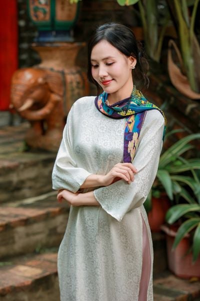 Màu sắc của chiếc khăn được chuyển dần từ nhạt đến đậm. Hai tầng dưới mang sắc vàng, nâu và xanh nhạt ấm áp, dịu dàng như ánh nắng phủ lên ruộng bậc thang buổi sớm. Lên cao, gam màu chuyển sang xanh lá đậm, xanh dương, hồng và tím gợi khung cảnh rạng sáng khi chị em lên nương rẫy, ánh nắng dịu dàng bắt đầu phủ lên ruộng bậc thang. Những sắc màu hòa quyện như lời cầu ước cho một vụ mùa bội thu, cho cuộc sống no đủ và tràn đầy sức sống. Tổng thể vừa mạnh mẽ, vừa tinh tế, mang trọn hơi thở của núi rừng Sapa và nhịp sống bình dị mà giàu yêu thương của con người nơi đây.