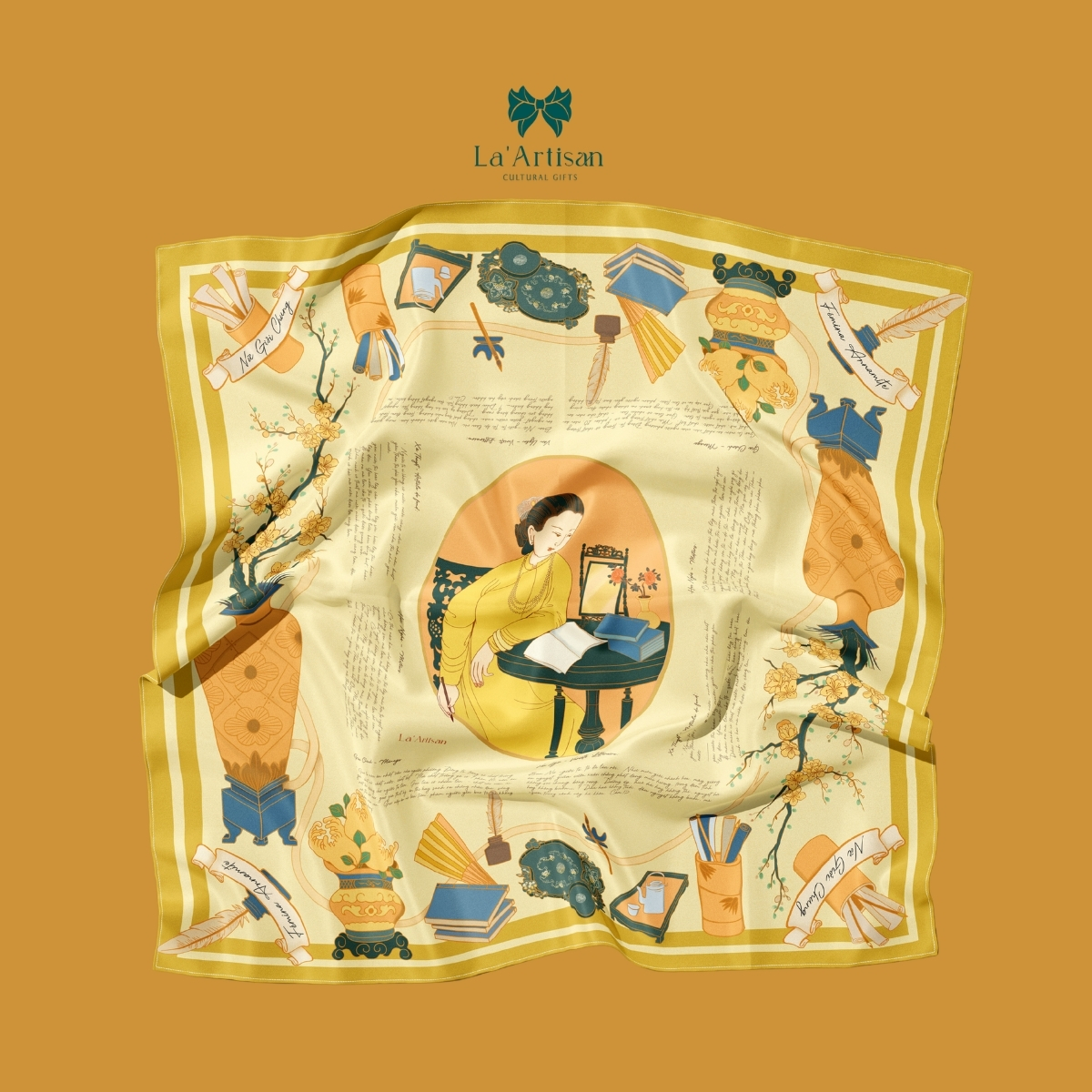 Chiếc khăn hoạ tiết nổi bật với gam màu vàng kem trang nhã, điểm xuyết bởi những hình ảnh tượng trưng cho tri thức và mỹ học truyền thống: sách bút, nghiên mực, quạt giấy, hoa mai nở rộ như một thư phòng Đông Dương cổ điển và trang trọng.