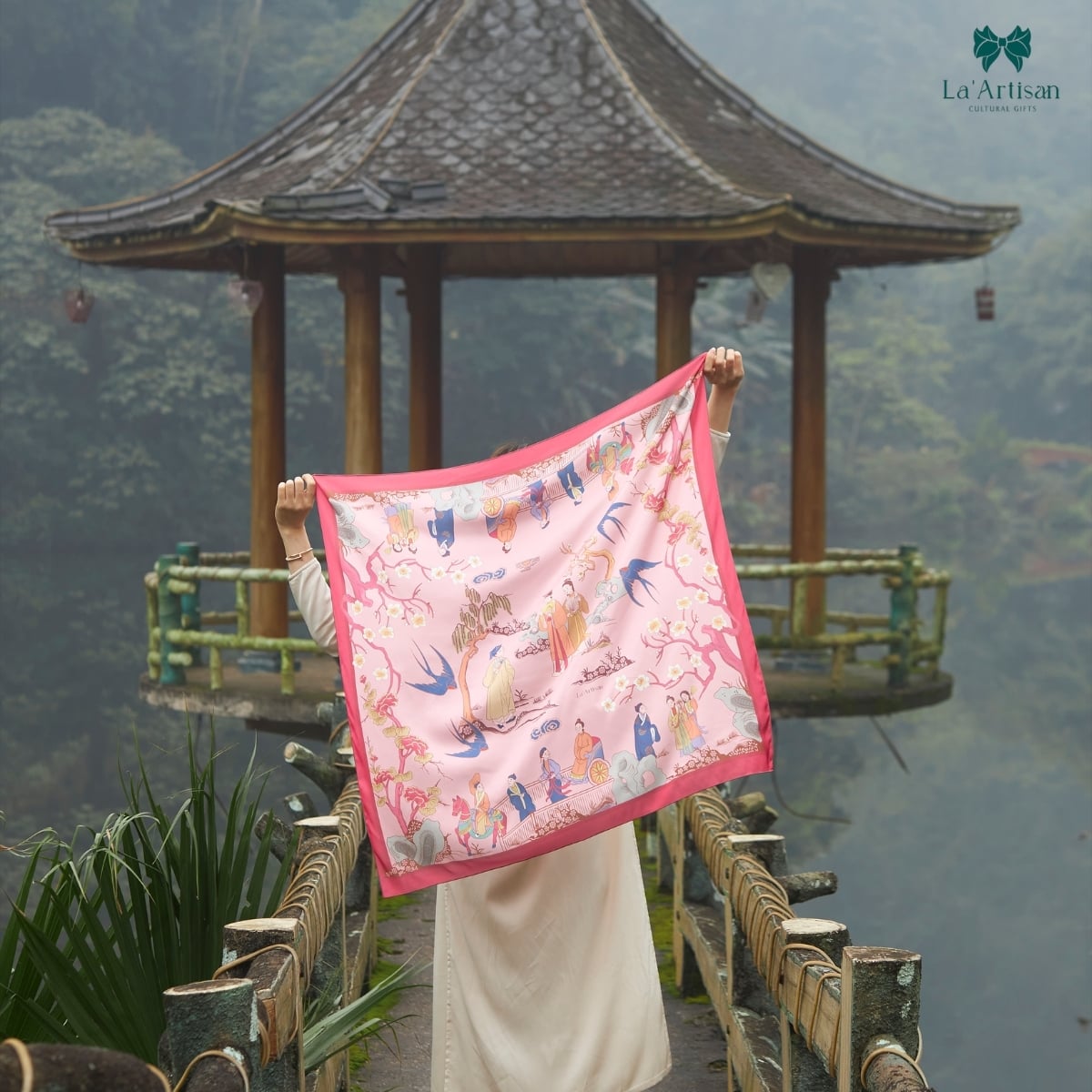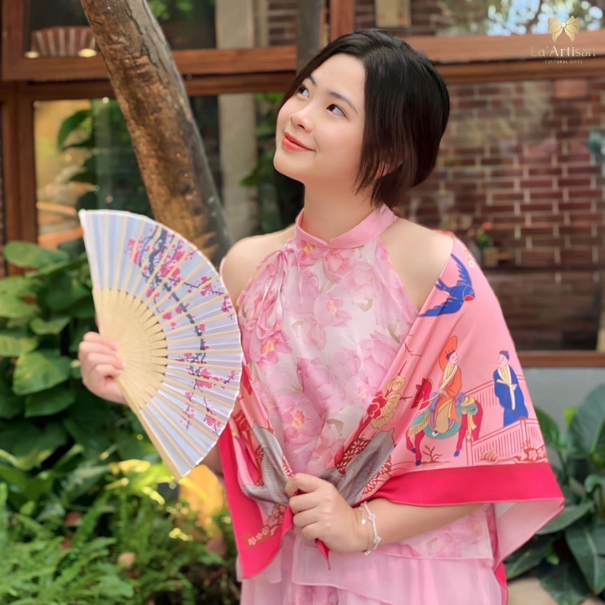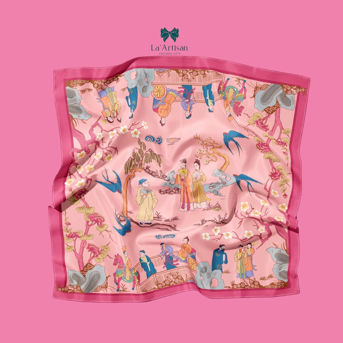 Chiếc khăn hoạ tiết cao cấp mang tông hồng phấn dịu dàng làm nền, được điểm xuyết bởi những họa tiết mô phỏng tranh dân gian và lối vẽ truyền thần phương Đông: những cánh én bay lượn, cành đào, cội liễu, những đôi nam nữ trong trang phục truyền thống bước đi giữa vườn xuân.