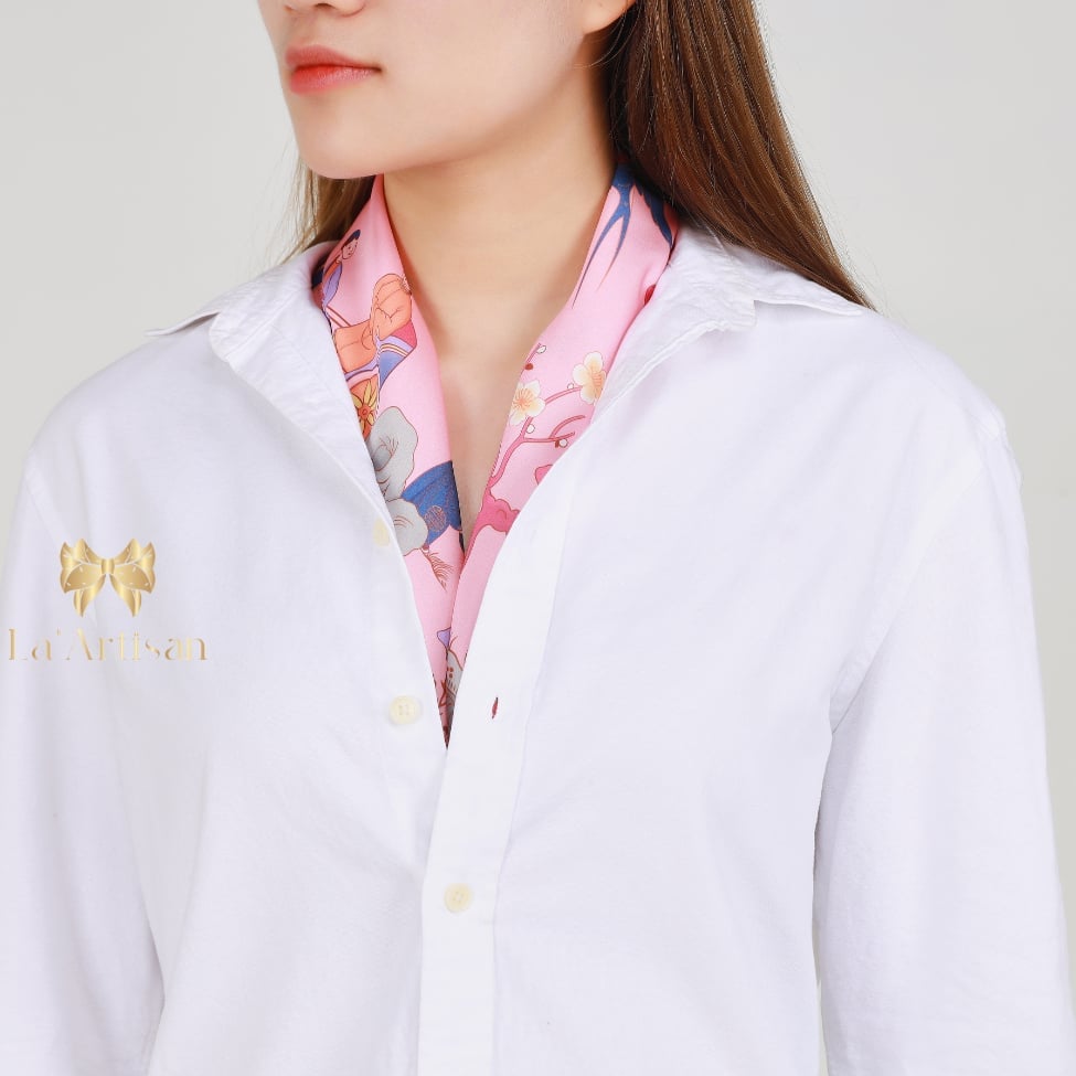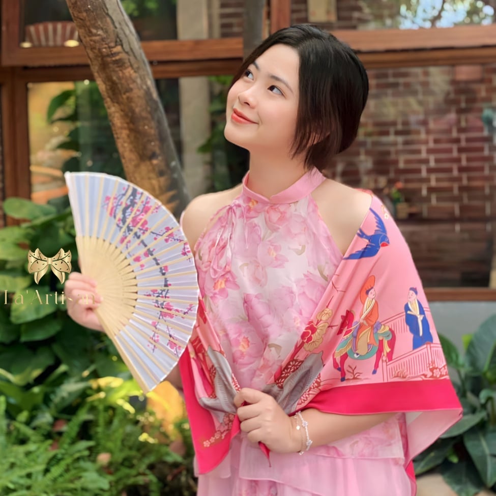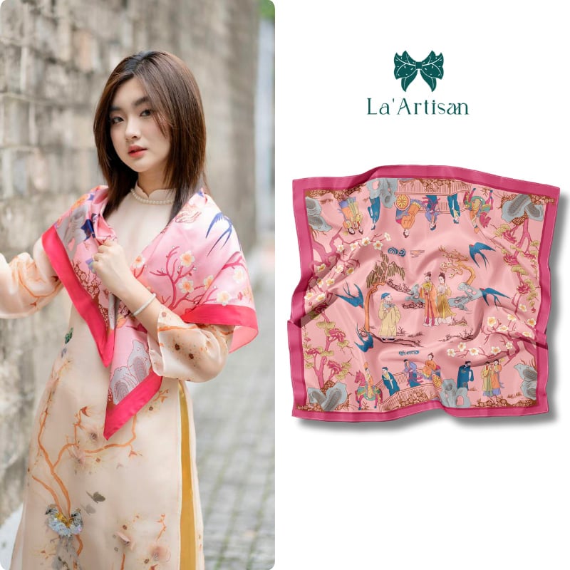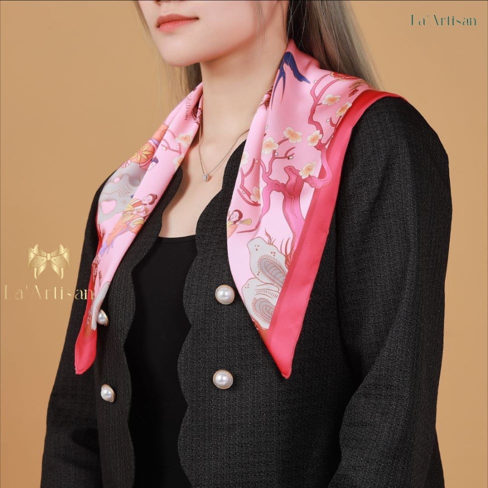Chiếc khăn lụa cao cấp mang tông hồng phấn dịu dàng làm nền, được điểm xuyết bởi những họa tiết mô phỏng tranh dân gian và lối vẽ truyền thần phương Đông: những cánh én bay lượn, cành đào, cội liễu, những đôi nam nữ trong trang phục truyền thống bước đi giữa vườn xuân.