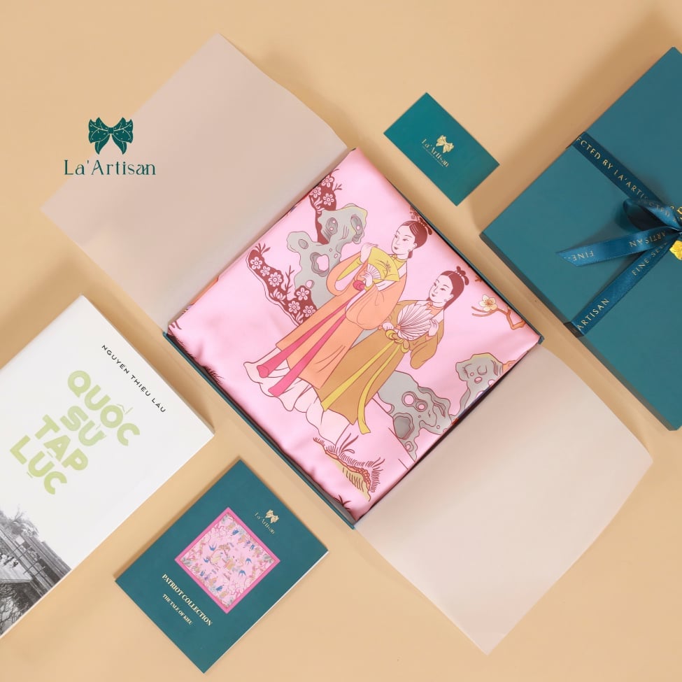 Hình ảnh vừa thanh tân vừa sinh động ấy đã được thổi hồn vào từng đường nét thiết kế của khăn lụa một cách tinh tế, như một bản hòa ca giữa thi ca cổ điển và mỹ thuật đương đại.