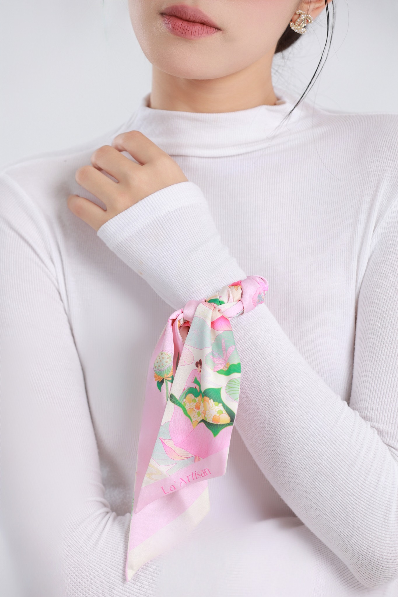 Chiếc khăn họa tiết sen Đồng Tháp được lấy cảm hứng từ vẻ đẹp mỏng manh nhưng tràn đầy sức sống của hoa sen nở quanh năm. Đội ngũ thiết kế của La’Artisan đã khéo léo tái hiện hình ảnh hoa sen, lá sen và vân sen trên nền xanh nhạt, xanh dương dịu nhẹ, xen lẫn những hình ảnh nhỏ bé của con người: đi thuyền, hái sen hay chế biến sen, tạo nên một tổng thể hài hòa vừa sinh động, vừa đậm chất văn hóa người dân Đồng Tháp.