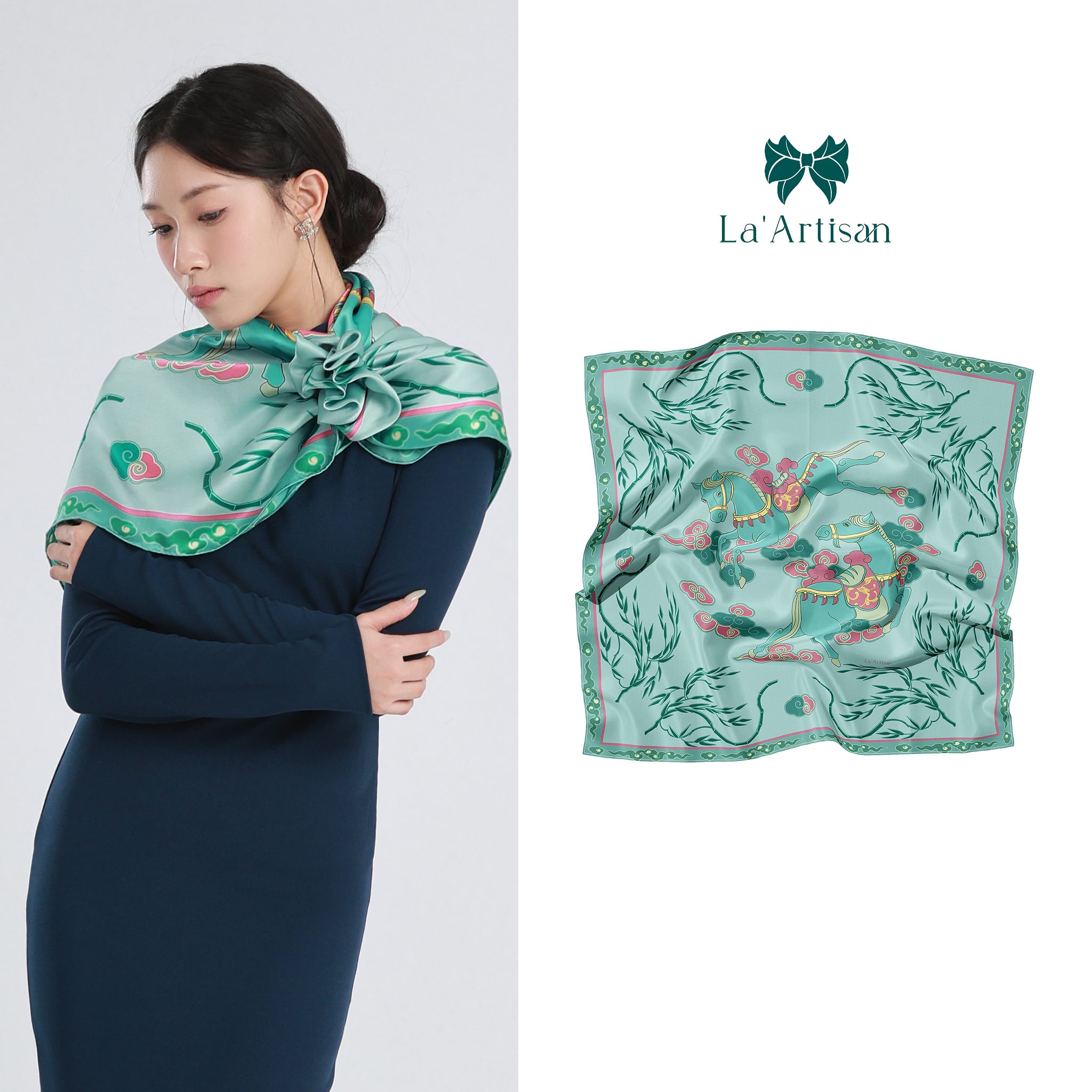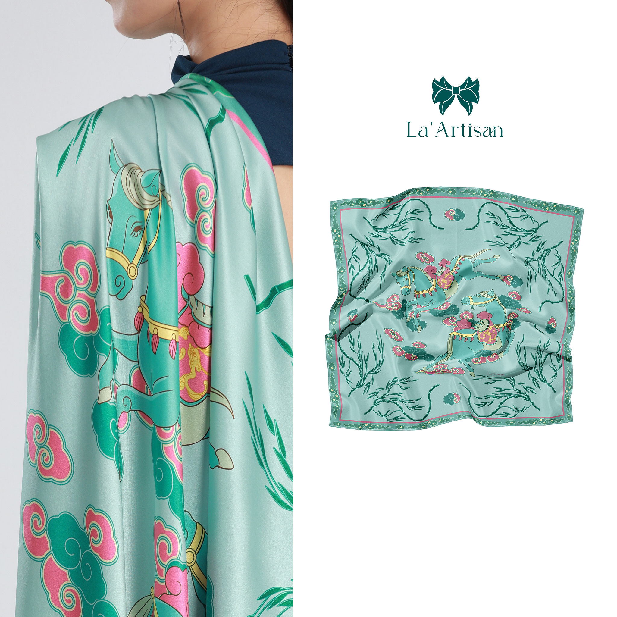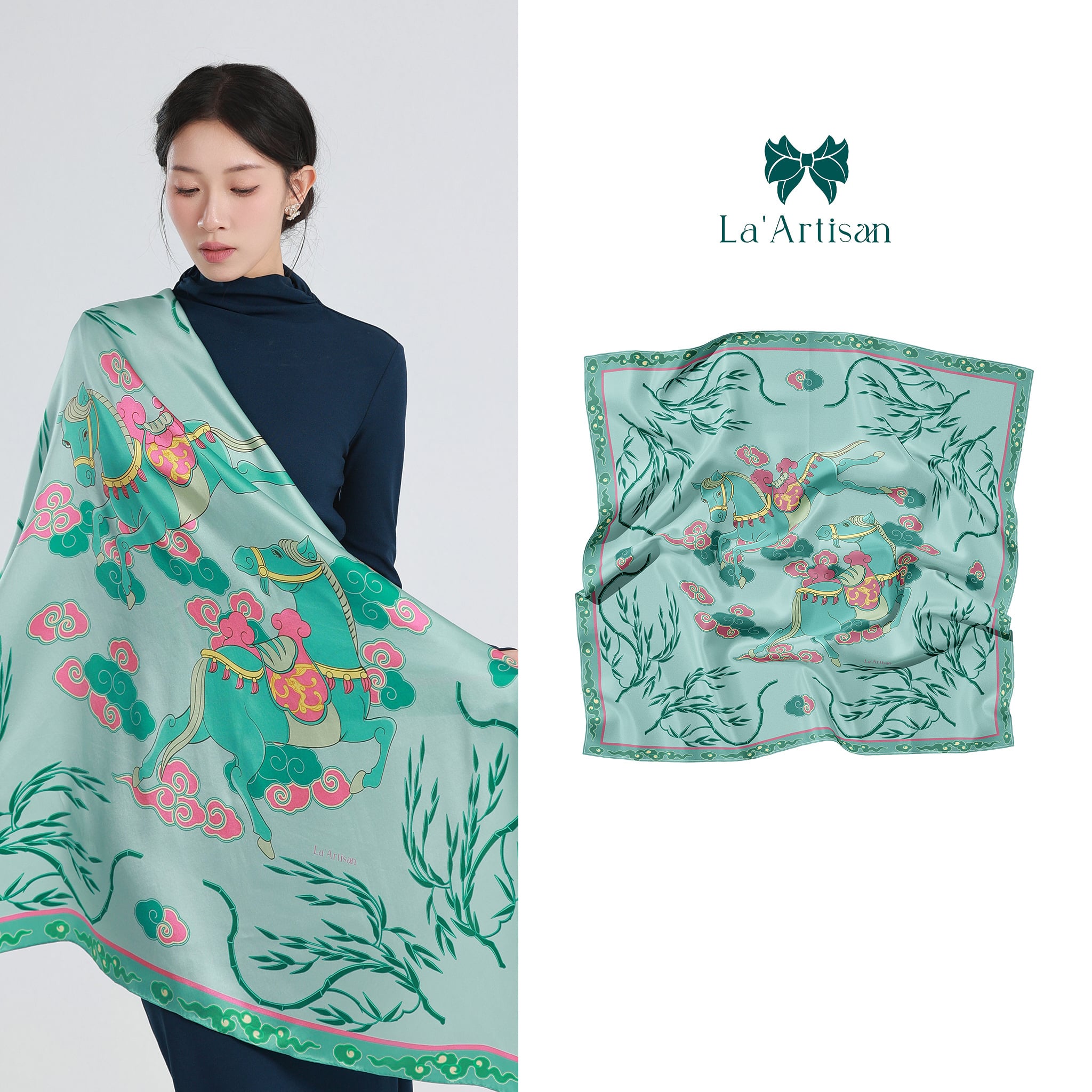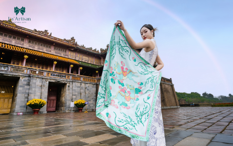 Xuất phát từ điển tích “Mã Liễu” trong lời nguyện chúc của người xưa, chiếc khăn “Liễu Mã” trong BST Đại Nam được sáng tạo một cách hiện đại với hình ảnh đôi ngựa phi nước kiệu dưới tán liễu biếc.