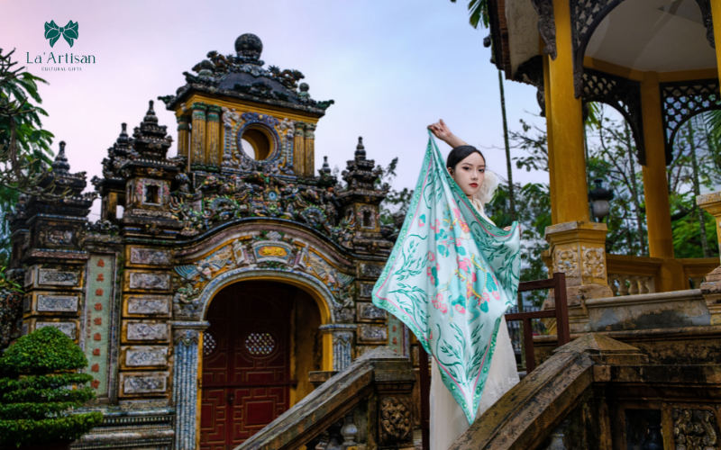Với phối sắc xanh - hồng tươi tắn cũng như hoạ tiết sinh động, hiện đại, tổng thể chiếc khăn đem đến sự phóng khoáng, tự do mà không kém phần thanh lịch, nhã nhặn cho người mặc. Đồng thời, tái hiện chất liệu cổ truyền với nguyên lý âm - dương cân bằng và lời chúc cầu may mắn, thuận lợi, “Liễu Mã” trong BST Đại Nam trở thành một quà tặng văn hóa ý nghĩa để thể hiện nhắn gửi và tâm ý chân thành của bạn.