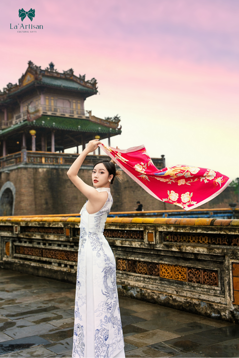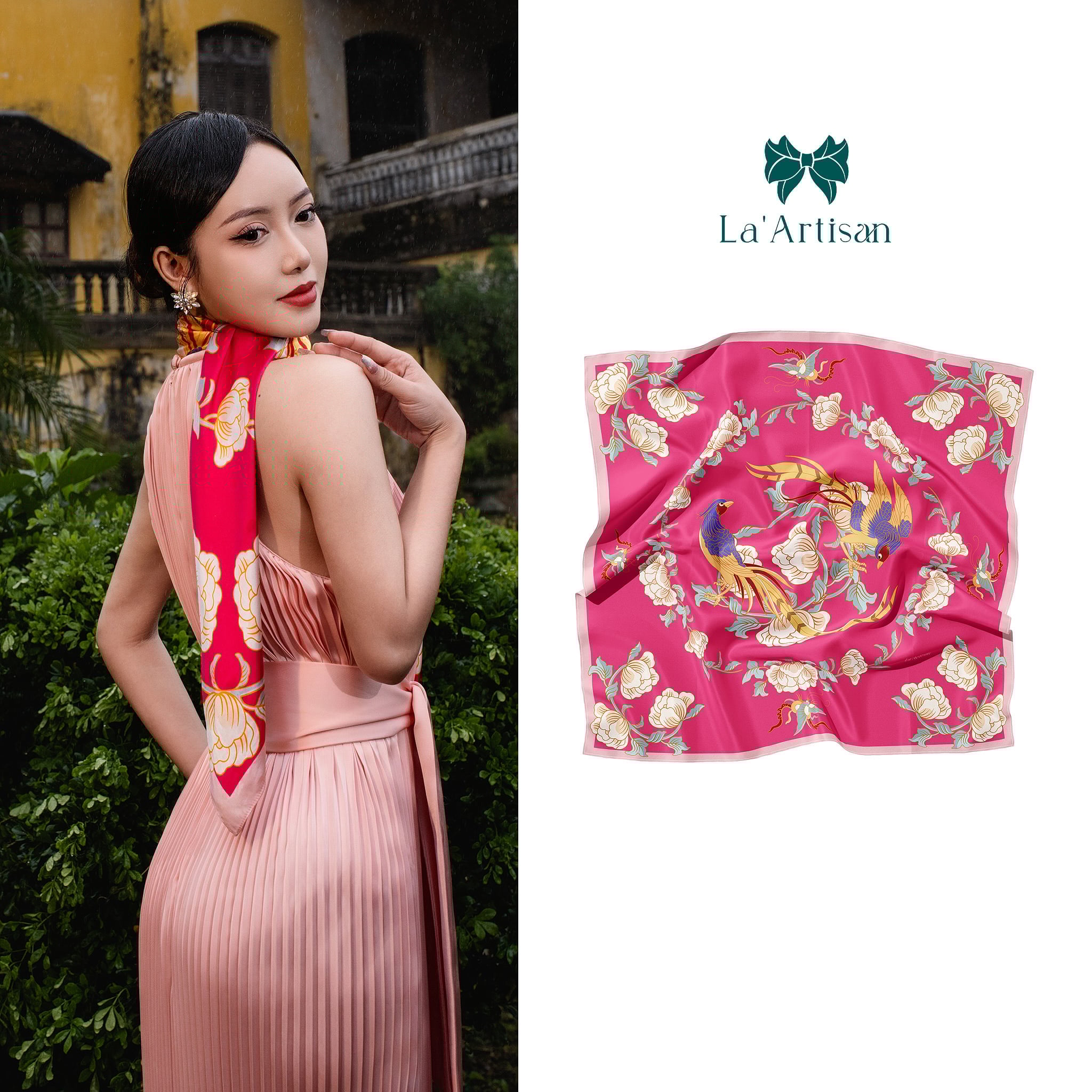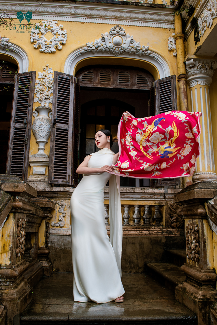 Được sắp đặt khéo léo như một khúc giao hòa giữa truyền thống và hiện đại, đường nét mềm mại của chim trĩ và hoa mẫu đơn được thiết kế với tinh thần tôn vinh gắn kết, bền chặt trong tình thân và tình yêu. Nền khăn mang sắc hồng ngọc dịu dàng, vừa gợi lên sự đằm thắm trong tình yêu vừa tôn vinh nét đẹp sang trọng, quyền quý của người phụ nữ Á Đông. Không chỉ là một món phụ kiện trang nhã, “Chim trĩ và Mẫu đơn” là sự gửi gắm thông điệp sâu sắc về tình cảm vững bền và niềm tự hào về cội nguồn, như một tấm chân tình đầy tinh tế dành tặng những người phụ nữ yêu kiều và đằm thắm.