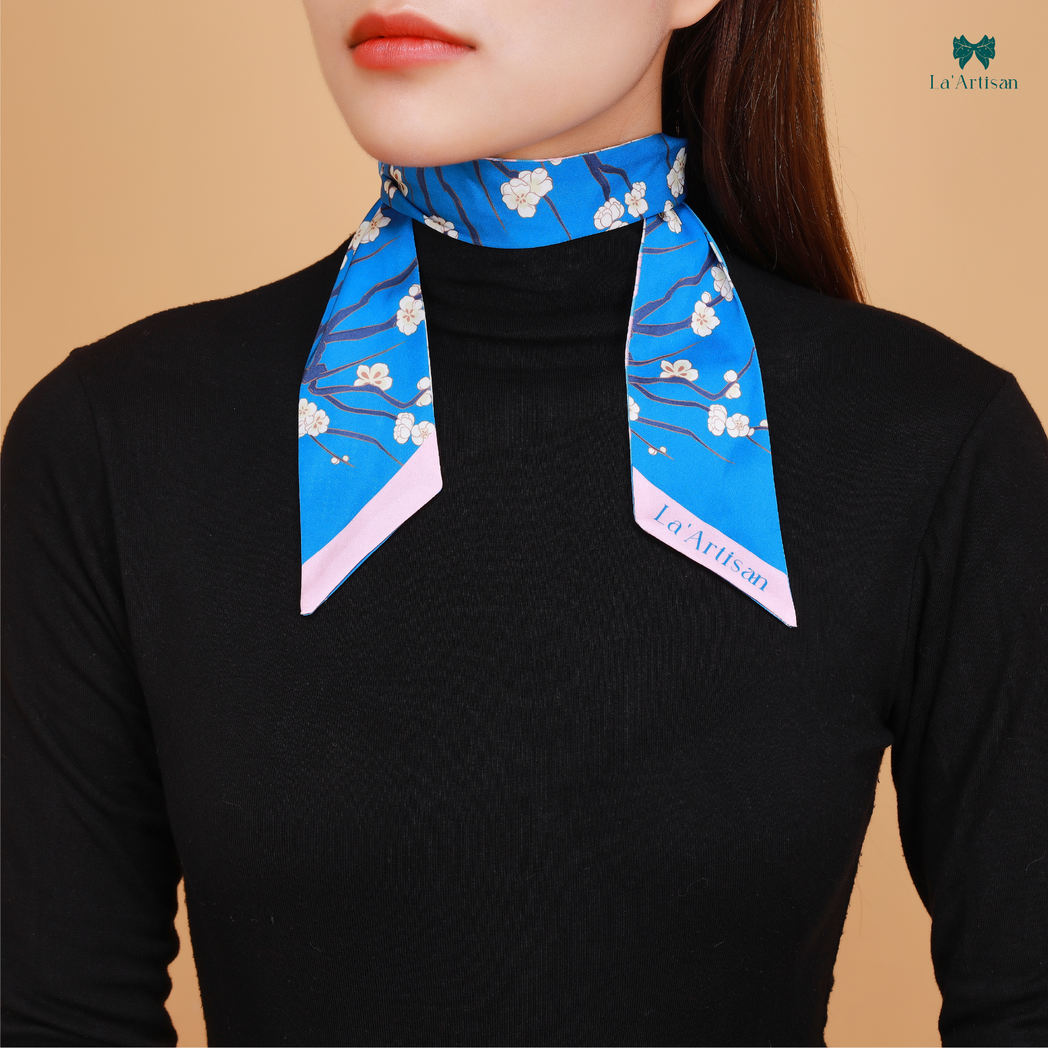 Được chế tác từ chất liệu satin bóng mượt, chiếc khăn lụa cao cấp mang sắc xanh lam trầm thanh lịch làm nền chủ đạo. Trên nền ấy, những cành hoa mơ trắng - biểu tượng của vẻ đẹp thanh tân và khí chất tự do nở rộ như một khu vườn đang thì thầm lời thơ.