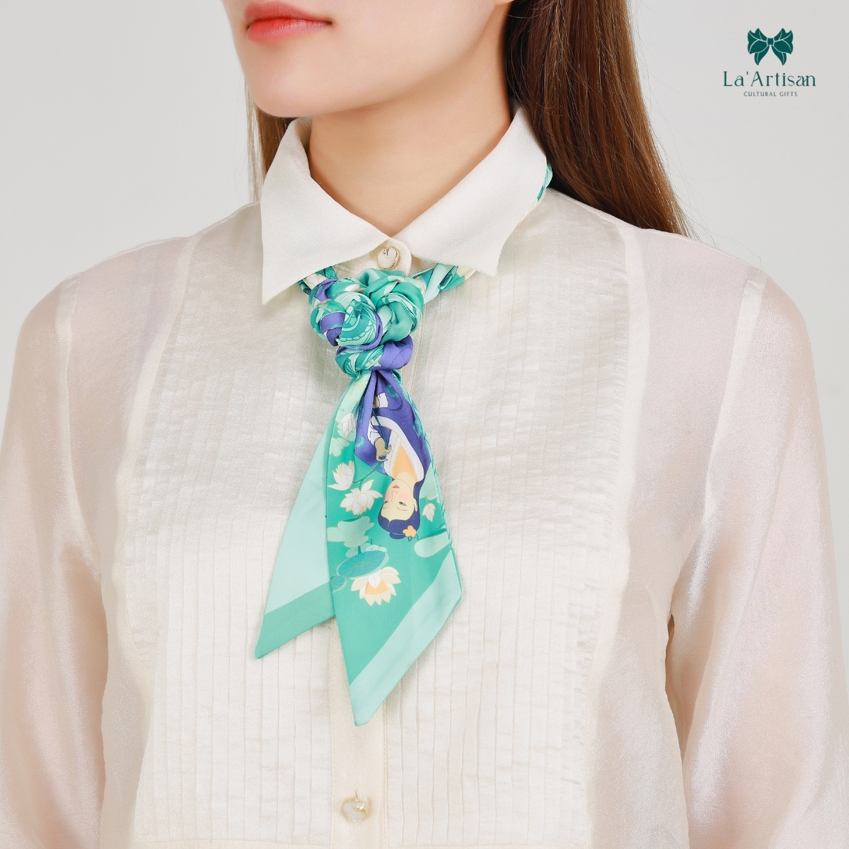 Cùng với đó, tông xanh ngọc thanh khiết đã được sử dụng làm nền chủ đạo cho chiếc khăn hoạ tiết để kết hợp cùng họa tiết hoa sen mềm mại - biểu tượng của cốt cách thanh cao giữa chốn trần ai.