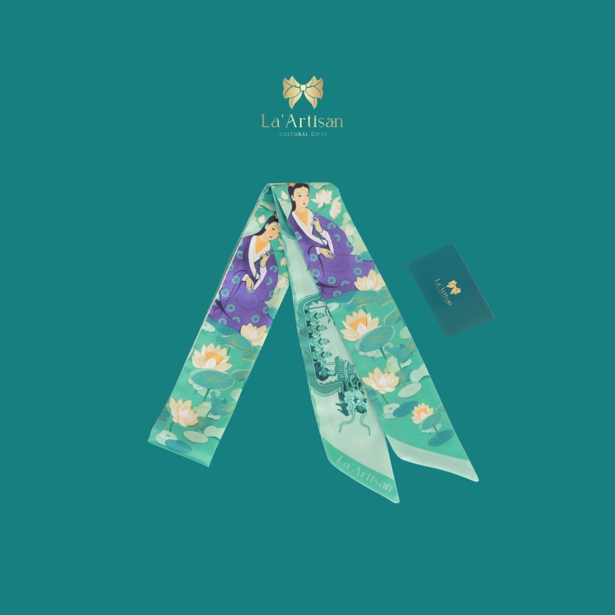 Chiếc khăn hoạ tiết được thiết kế với trung tâm sản phẩm là hình ảnh Công chúa An Tư trong tư thế ngồi trầm lặng giữa hồ sen, đôi mắt nghiêng về phía xa như đang trăn trở nhìn về tương lai đất nước