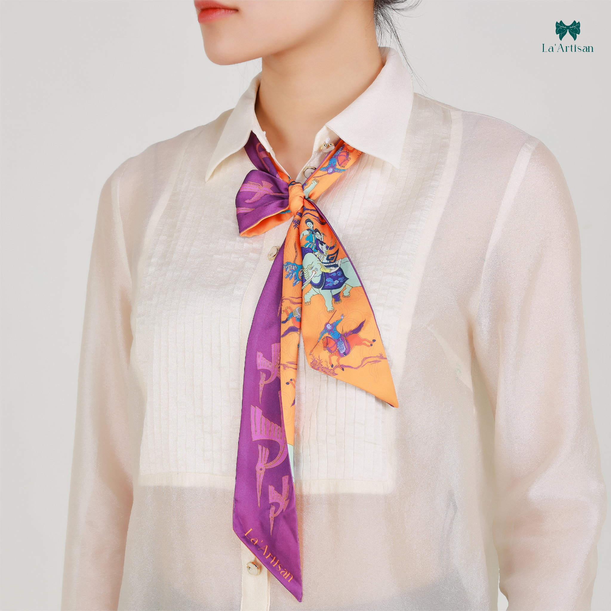 Lấy cảm hứng từ hình tượng Hai Bà Trưng - hai nữ anh hùng đầu tiên trong lịch sử dân tộc, La’Artisan ra mắt thiết kế khăn lụa hoạ tiết Trưng Nữ Vương như một khúc tráng ca bằng lụa về tinh thần bất khuất và vẻ đẹp kiêu hùng của người phụ nữ Việt.