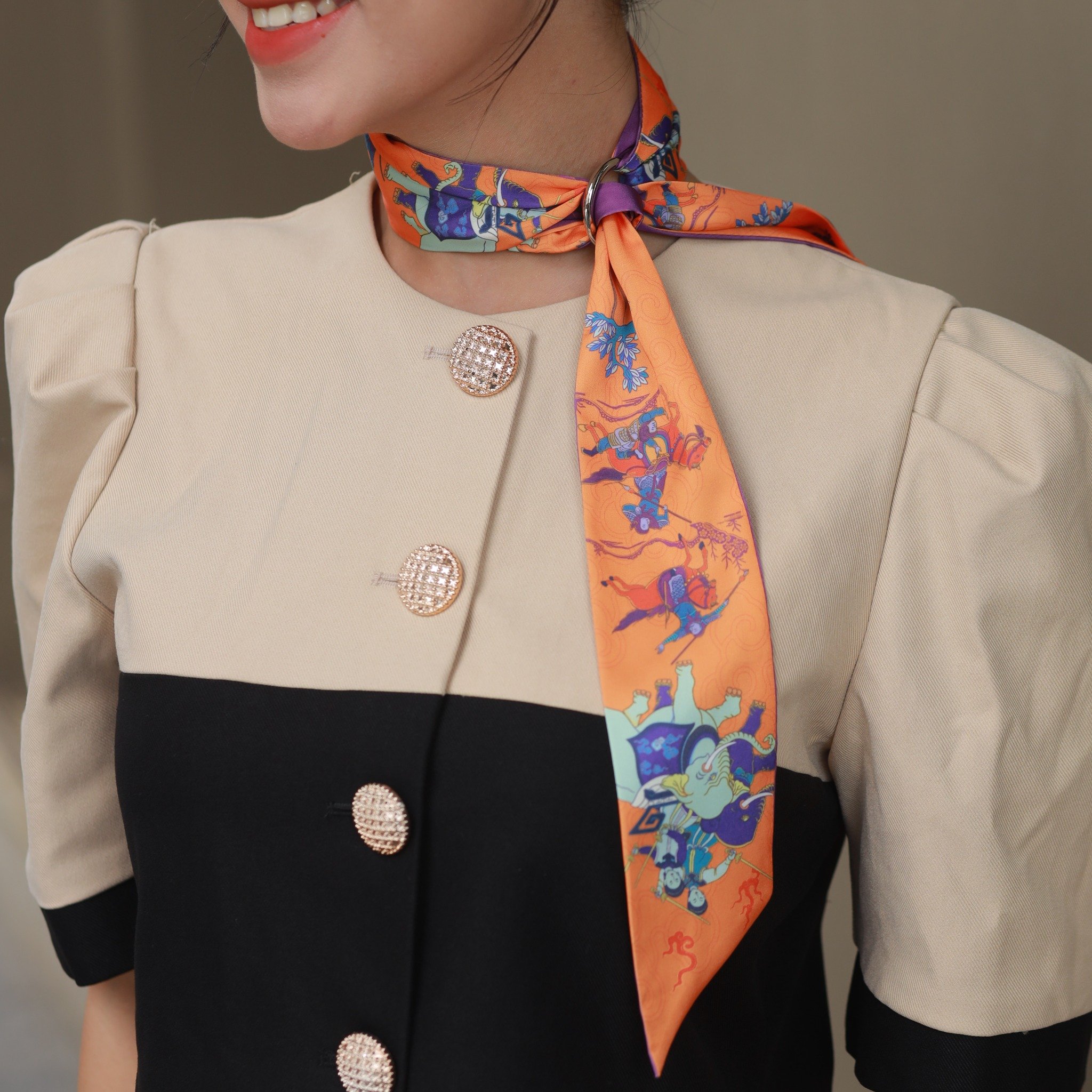 Chiếc khăn lụa hoạ tiết Hai Bà Trưng không chỉ tôn vinh nhan sắc kiêu hùng của nữ anh hùng dân tộc, mà còn gợi nhắc về vai trò của người phụ nữ trong dòng chảy lịch sử. Khi khoác lên mình chiếc khăn lụa, người phụ nữ hiện đại như tiếp nối khí phách của tiền nhân, thể hiện sự tự tin, độc lập và bản lĩnh. Đây là quà tặng lý tưởng cho những ai tìm kiếm sự giao thoa giữa thời trang cao cấp và bản sắc dân tộc.