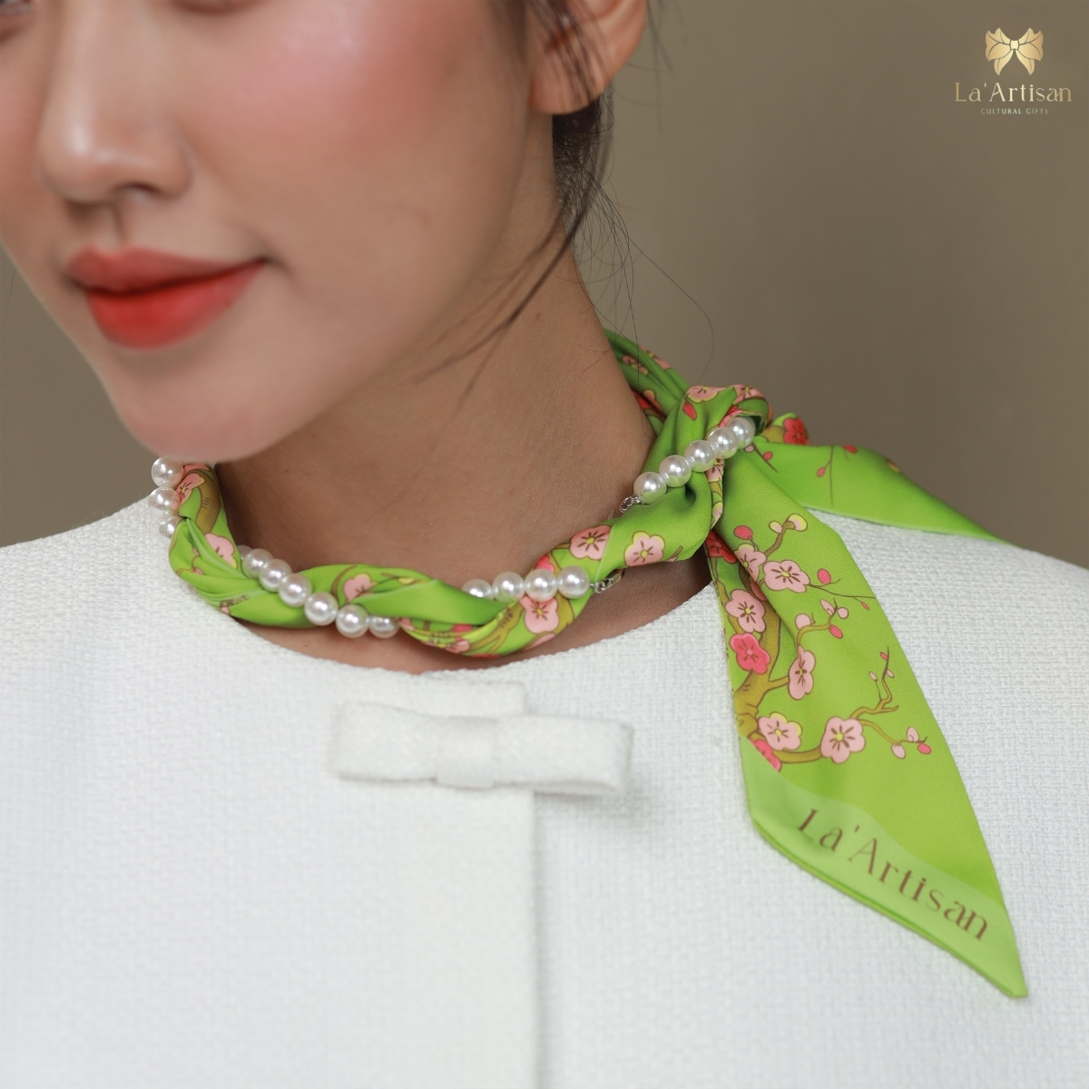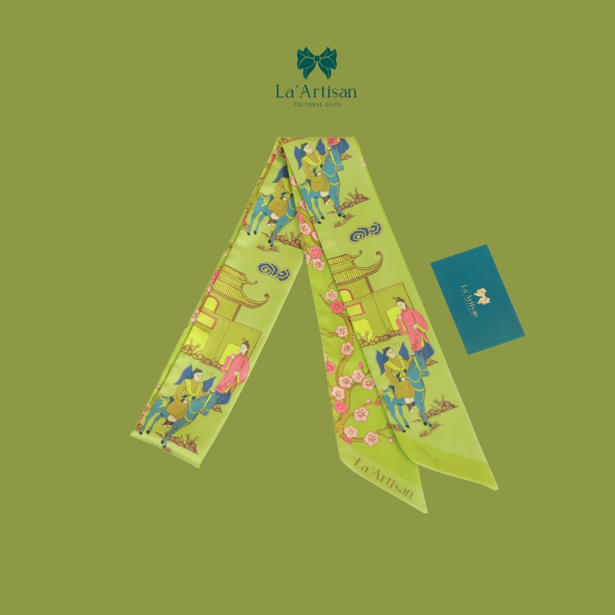 Chiếc khăn hoạ tiết cao cấp được chế tác thủ công và mang sắc xanh non của xuân Thăng Long - nơi khởi đầu mối duyên tiền định. Với trung tâm thiết kế là hình ảnh Nguyễn Huệ cưỡi ngựa chiến trở về, được công chúa Ngọc Hân đón giữa hoa đào rộ nở, chiếc khăn lụa hoạ tiết gửi gắm thông điệp về sự tái sinh và hòa hợp, cũng như một tình yêu đương độ viên mãn, vẹn tròn.