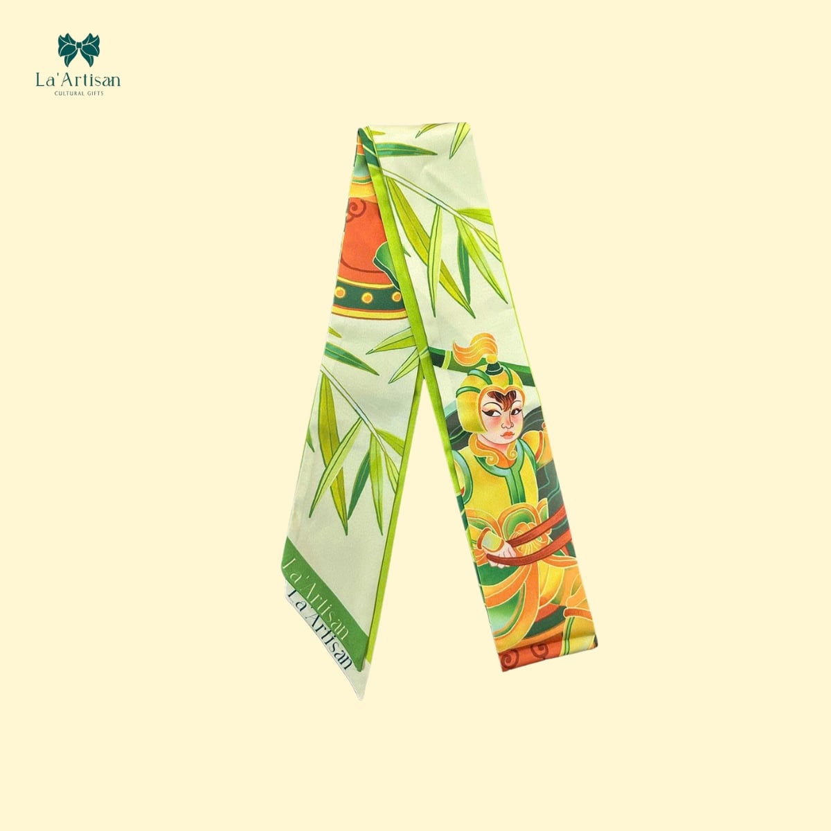Hơn thế, cách phân lớp màu giữa tre – lửa – núi – mây trên chiếc khăn họa tiết Thánh Gióng không những tái hiện không gian sử thi mà còn đưa vào chiều sâu triết học: sức mạnh không đến từ gươm giáo, mà từ ý chí và lòng kiên cường... Bằng bút pháp mềm mại, phối sắc sống động La’Artisan đã tạo nên một khăn họa tiết vừa có khí phách, vừa giữ được vẻ nghệ thuật đầy tinh tế.