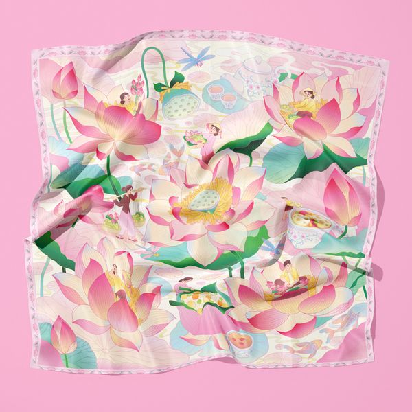 Chiếc khăn họa tiết sen Đồng Tháp được lấy cảm hứng từ vẻ đẹp mỏng manh nhưng tràn đầy sức sống của hoa sen nở quanh năm. Đội ngũ thiết kế của La’Artisan đã khéo léo tái hiện hình ảnh hoa sen, lá sen và vân sen trên nền xanh nhạt, xanh dương dịu nhẹ, xen lẫn những hình ảnh nhỏ bé của con người: đi thuyền, hái sen hay chế biến sen, tạo nên một tổng thể hài hòa vừa sinh động, vừa đậm chất văn hóa người dân Đồng Tháp.