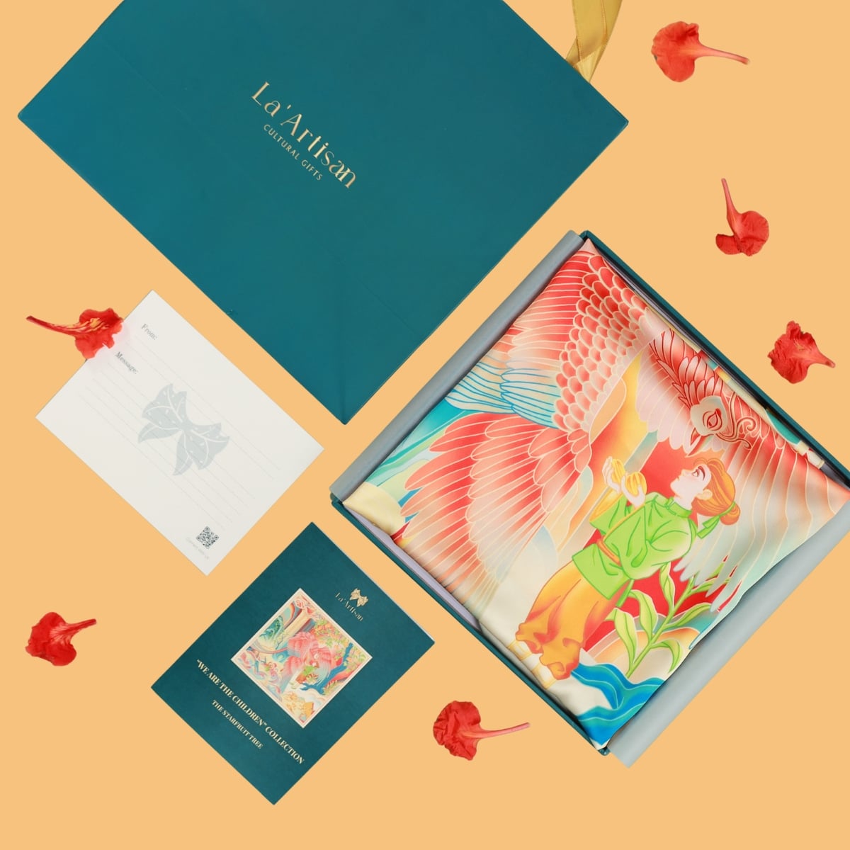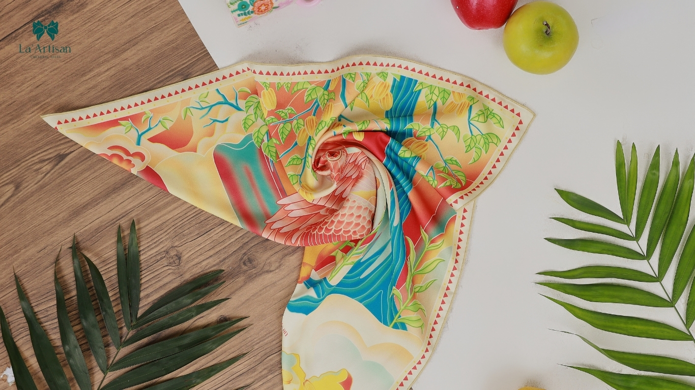 Trên nền chiếc khăn họa tiết cao cấp, thiết kế mở ra một thế giới huyền thoại: đôi cánh chim thần đỏ rực dang rộng giữa không gian cổ tích, đón lấy quả khế nhỏ bé mà chứa đựng lòng tốt hiền hòa. Từng mảng màu trên khăn họa tiết cũng được phối theo nguyên tắc thị giác Á Đông – lấy xanh lục và lam làm nền tĩnh, nhấn bằng cam đất, đỏ son và vàng sáng như ánh kim rơi.