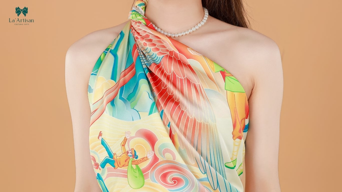 Từng chi tiết trong chiếc khăn hoạ tiết được sắp đặt khéo léo như một bản giao hưởng thị giác: khế nở hoa, túi ba gang, vàng bạc và mây ngũ sắc lấp lánh... tất cả đều gợi nhắc đến những biểu tượng sâu sắc trong văn hóa Việt. Được in trên nền lụa óng mượt, từng nét vẽ trên khăn lụa cao cấp được hoàn thiện thủ công với độ chính xác cao, tái hiện thần thoại bằng sự sinh động và tươi trẻ của mỹ thuật đương đại.