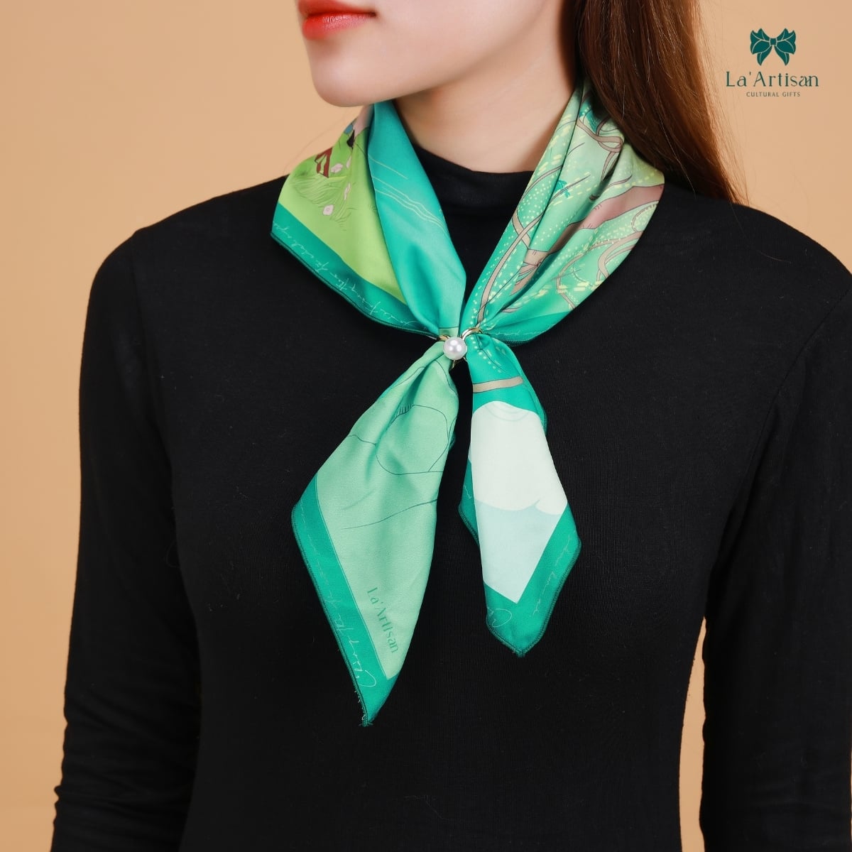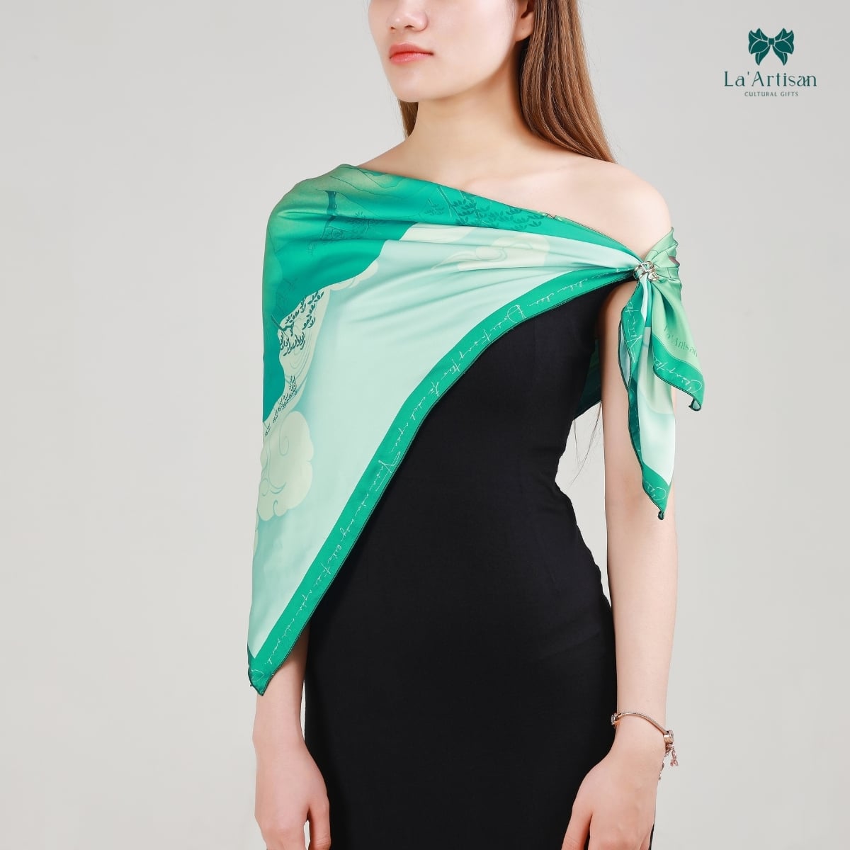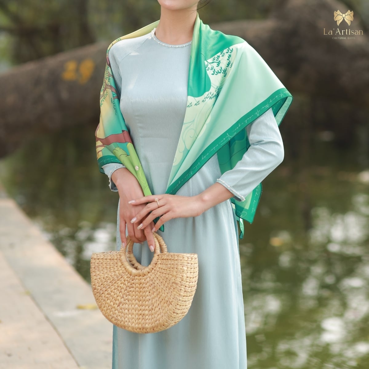 Chế tác từ chất liệu cao cấp với độ bóng tự nhiên và cảm giác mượt mà khi chạm tay, chiếc khăn hoạ tiết Đoàn Thị Điểm là một áng họa thơ trên chất liệu gấm vóc. Mỗi nếp gấp, mỗi góc cạnh trên khăn hoạ tiết đều mang dấu vết của một câu chuyện - nơi hội họa cổ truyền gặp gỡ thi ca lịch sử, nơi tâm hồn Việt được chuyển thể thành hình ảnh đầy tinh tế.