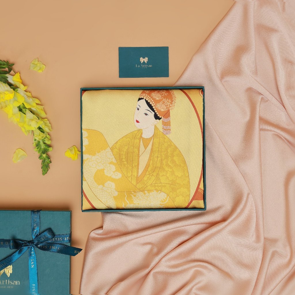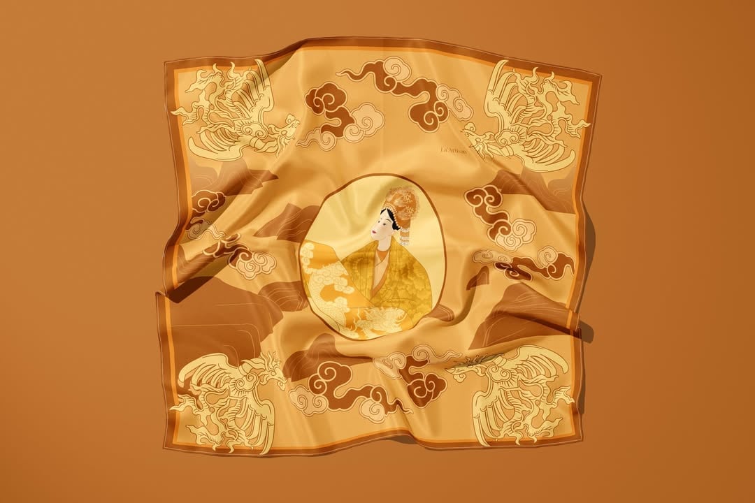 Thiết kế khăn lụa hoạ tiết lấy cảm hứng từ thời khắc lịch sử này, như một sự tri ân với khí phách và trí tuệ của người phụ nữ đứng sau ngai vàng, âm thầm gìn giữ nền hòa bình cho đất nước.