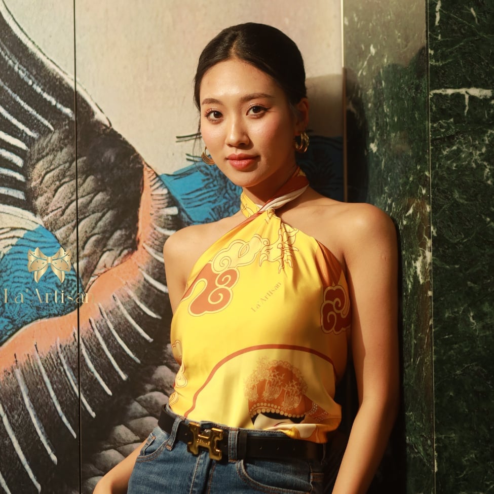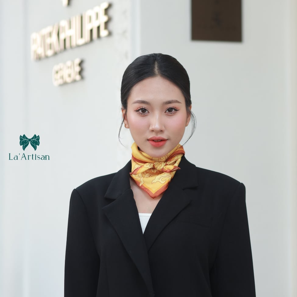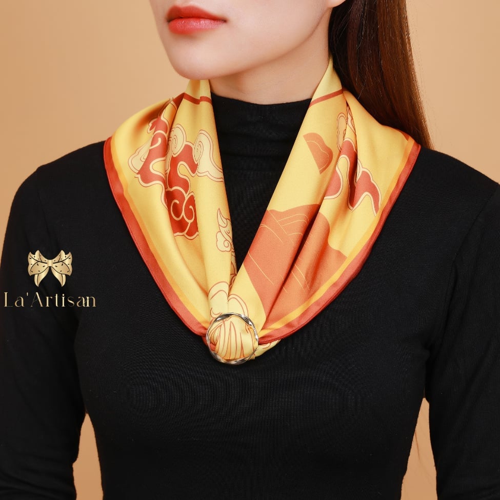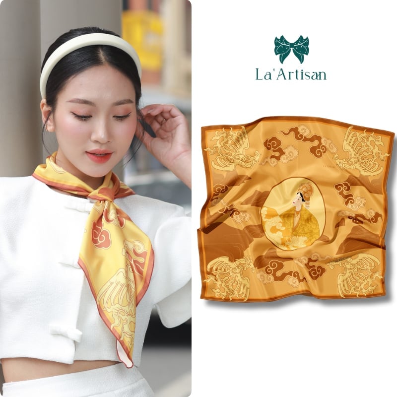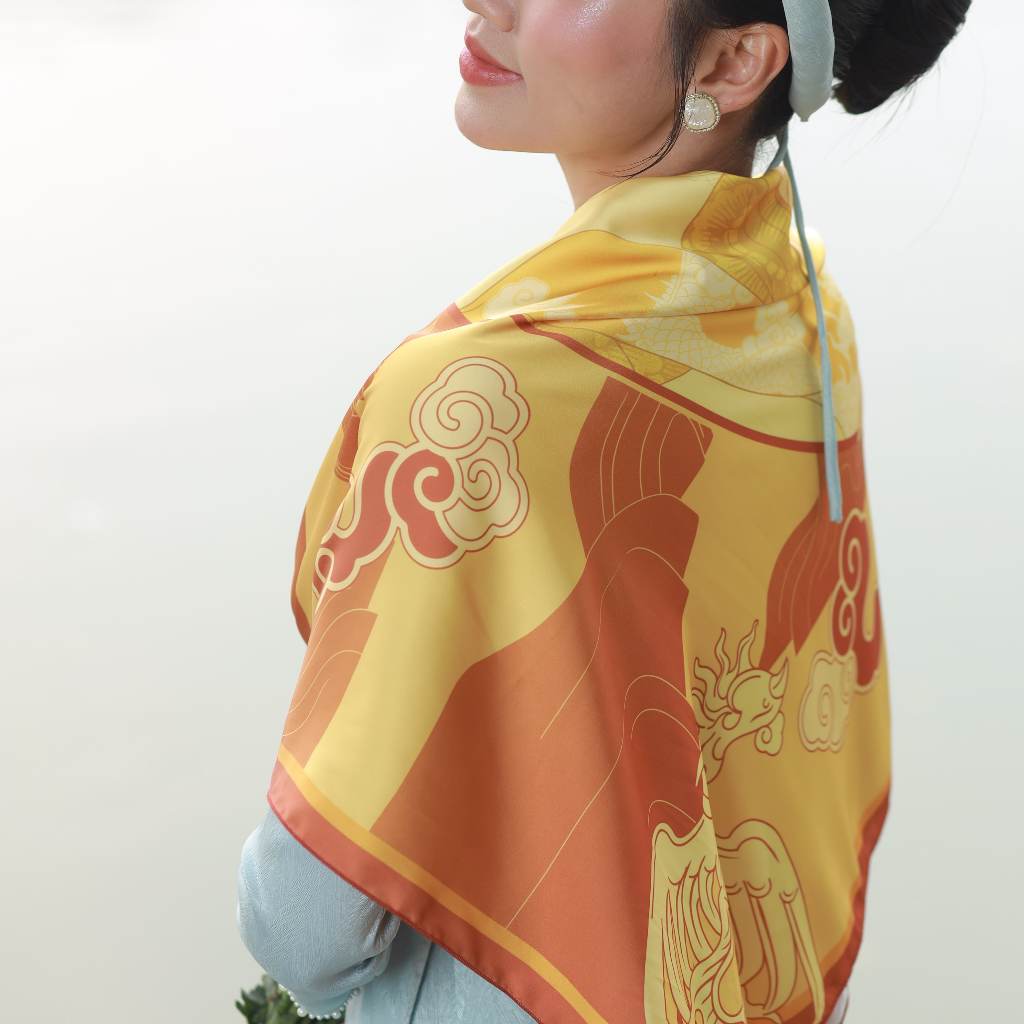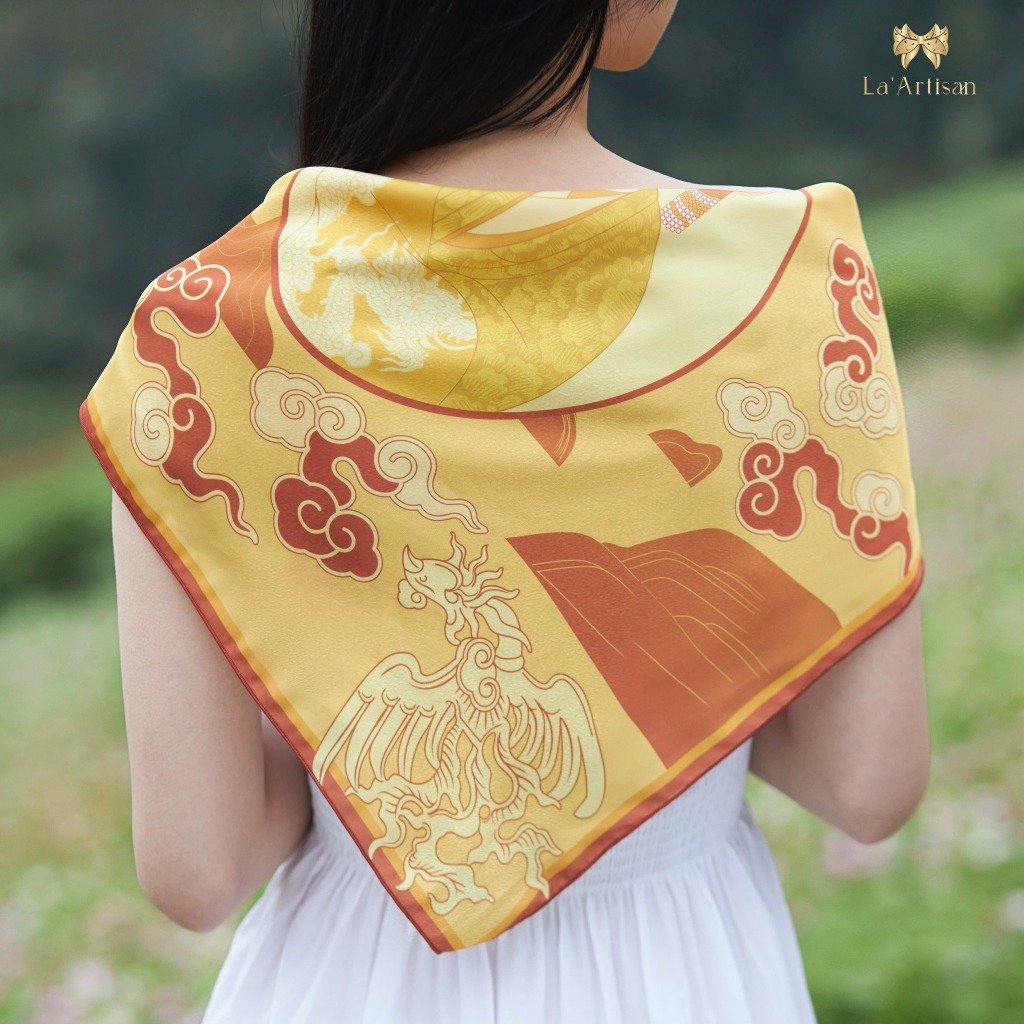 Khoác lên mình gam vàng son chủ đạo, chiếc khăn hoạ tiết biểu trưng cho hoàng quyền, phồn vinh và bản lĩnh. Từng chi tiết trên chiếc khăn lụa cao cấp được xử lý bằng kỹ thuật in tơ tằm cao cấp, trên nền khăn lụa óng mượt với độ phản quang mềm mại, tạo cảm giác vừa cổ điển vừa hiện đại.