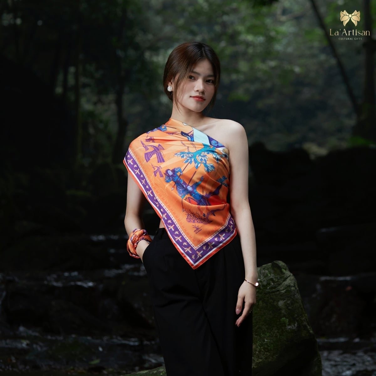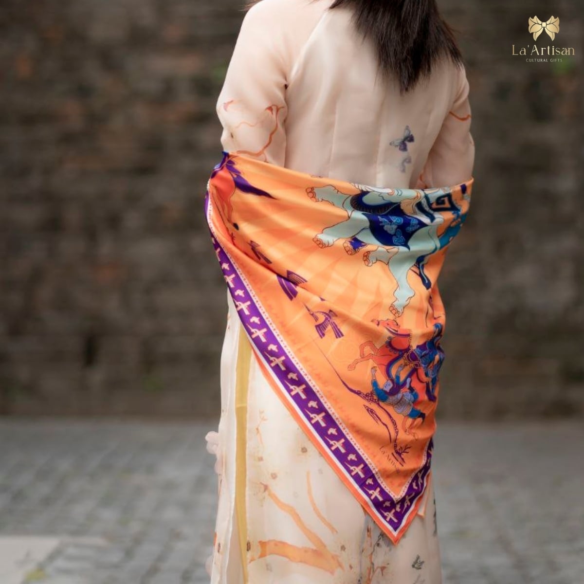 Chiếc khăn hoạ tiết Hai Bà Trưng không chỉ tôn vinh nhan sắc kiêu hùng của nữ anh hùng dân tộc, mà còn gợi nhắc về vai trò của người phụ nữ trong dòng chảy lịch sử. Khi khoác lên mình chiếc khăn hoạ tiết, người phụ nữ hiện đại như tiếp nối khí phách của tiền nhân, thể hiện sự tự tin, độc lập và bản lĩnh. Đây là quà tặng lý tưởng cho những ai tìm kiếm sự giao thoa giữa thời trang cao cấp và bản sắc dân tộc.