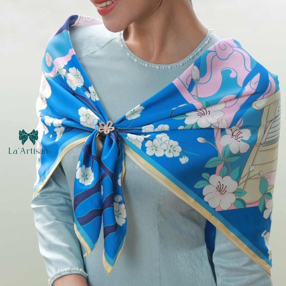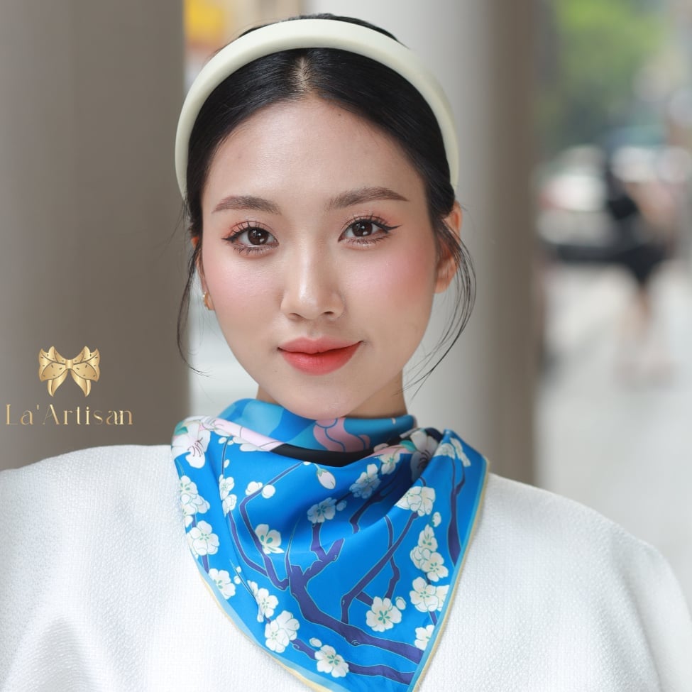 Được chế tác từ chất liệu satin bóng mượt, chiếc khăn lụa cao cấp mang sắc xanh lam trầm thanh lịch làm nền chủ đạo. Trên nền ấy, những cành hoa mơ trắng - biểu tượng của vẻ đẹp thanh tân và khí chất tự do nở rộ như một khu vườn đang thì thầm lời thơ.