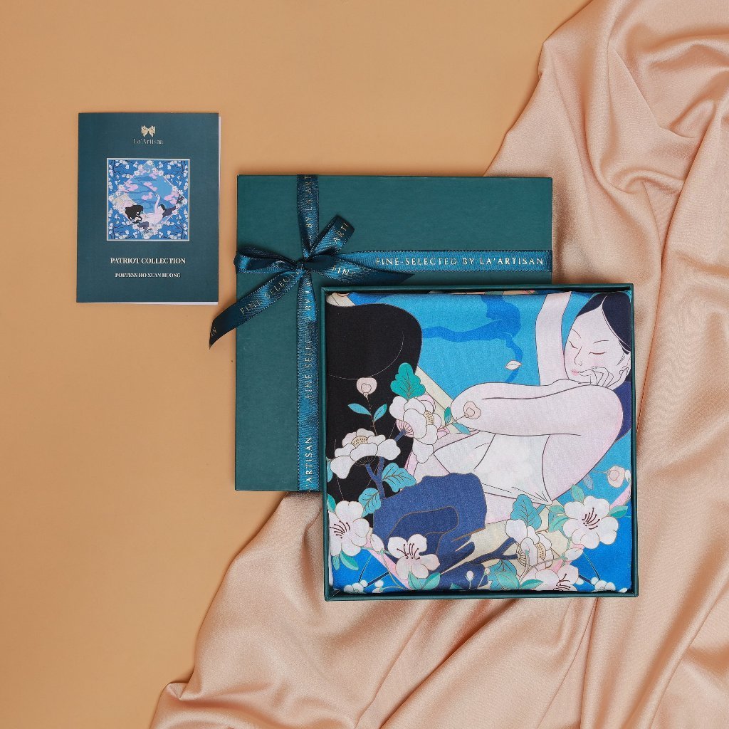 Lấy cảm hứng từ di sản ấy, La’Artisan thổi hồn vào khăn lụa hoạ tiết Hồ Xuân Hương để tạo nên một bức tranh thị giác mềm mại nhưng đầy nội lực, nơi thi ca lặng lẽ ngân vang qua từng nét cọ, từng nếp gấp lụa tinh khôi.