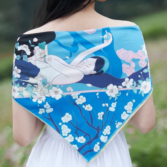Tâm điểm của khăn lụa là hình ảnh nữ sĩ Hồ Xuân Hương tựa vào trang sách, ánh mắt khép hờ, tay khẽ nâng cánh đào như đang múa cùng một giai điệu vô thanh của tự do và trí tuệ. Những dải mây hồng uốn lượn bay ngang trời trên chiếc khăn hoạ tiết nữ sĩ Hồ Xuân Hương cũng góp phần gợi lên những tứ thơ phóng khoáng, phiêu du và bất khuất.