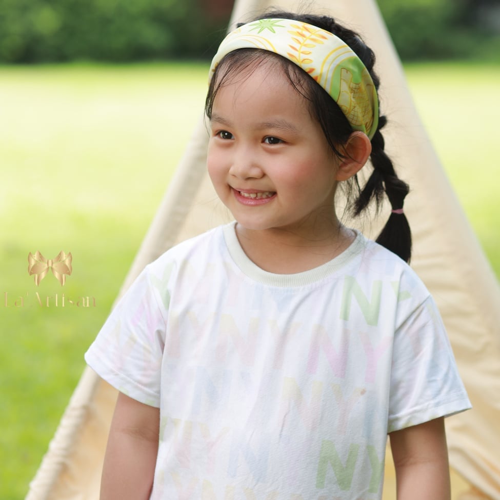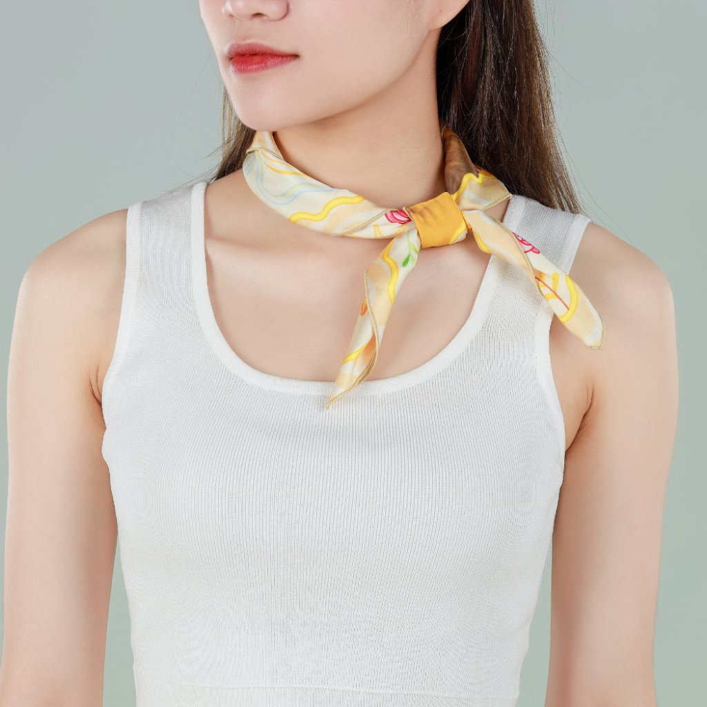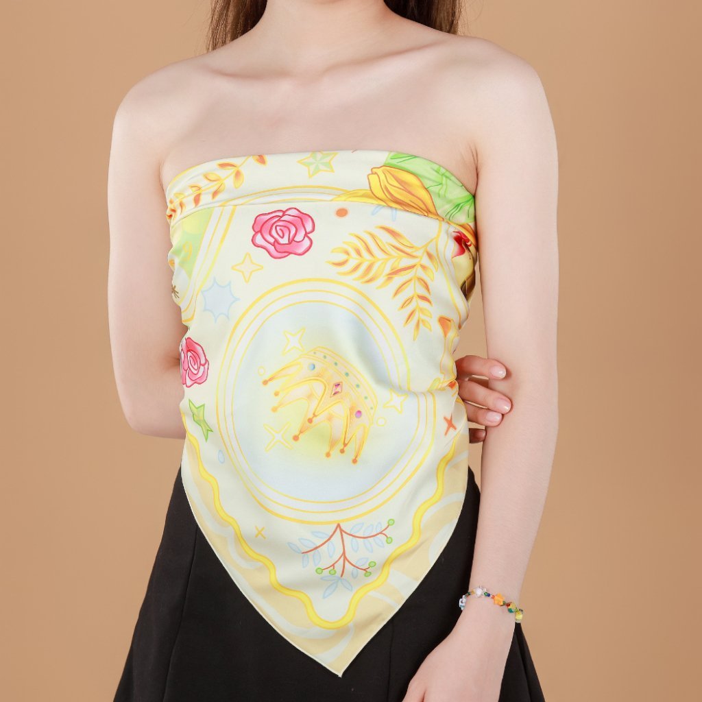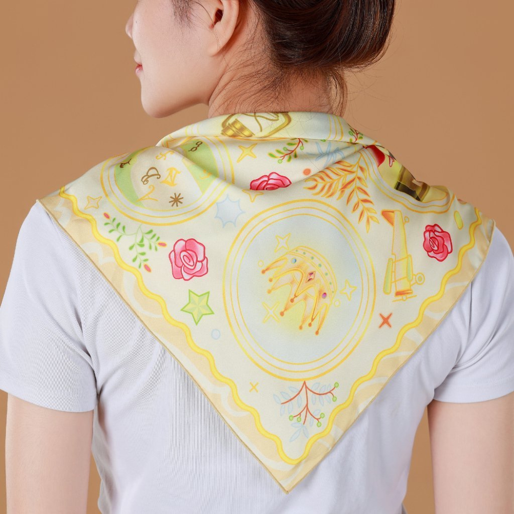 Chiếc khăn lụa cao cấp được chế tác thủ công trên nền lụa thượng hạng, với gam vàng kem gợi ánh bình minh sương mai. Màu vàng pastel chủ đạo được phối tinh tế với những mảng màu xanh lá, đỏ hồng tạo nên một bản hòa ca màu sắc giàu cảm xúc. Với kỹ thuật in hiện đại, từng chi tiết trên khăn lụa hoạ tiết trở nên sinh động như một trang truyện tranh bay bổng giữa đời thực.