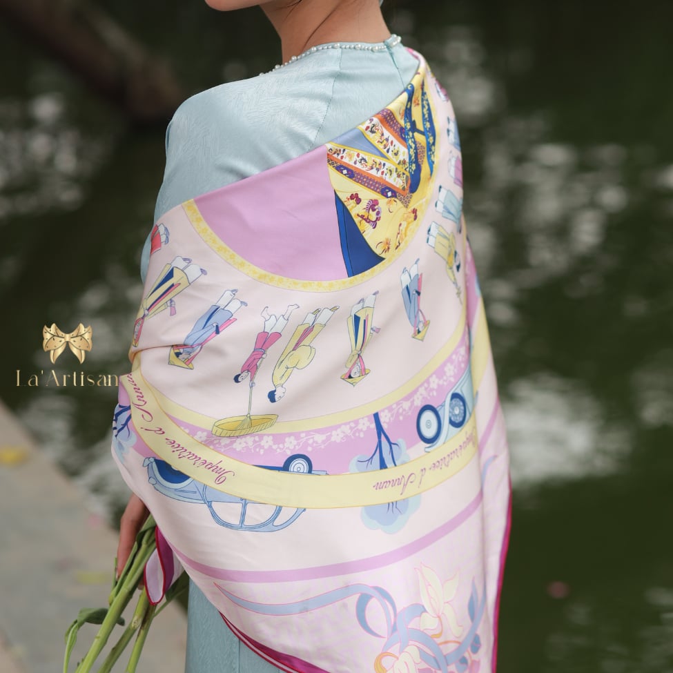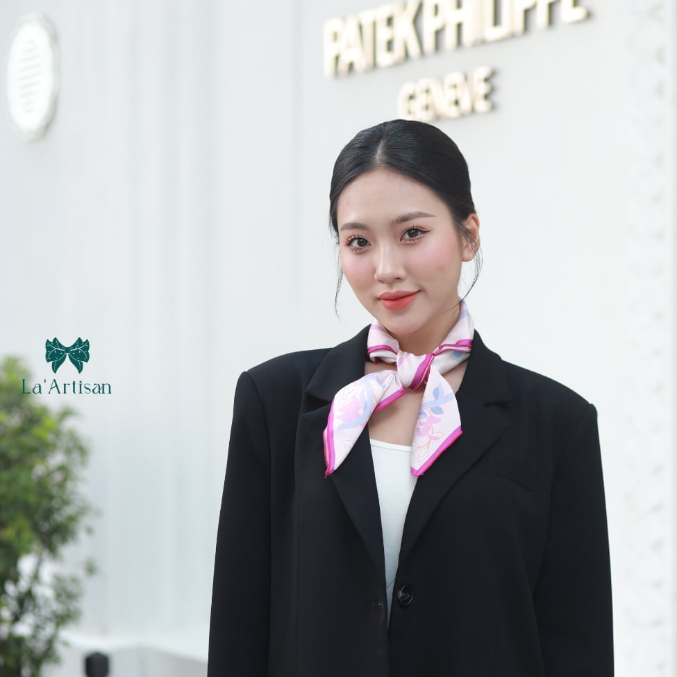Với đường nét uyển chuyển, chiếc khăn lụa được bố trí theo cấu trúc vòng tròn liên hoàn, tạo cảm giác cổ điển nhưng không nặng nề. Các họa tiết như dây leo, hoa mai và nét viết tay cũng góp phần mang đến sự mềm mại và gần gũi, làm nổi bật tinh thần nữ tính một cách kín đáo, không phô trương.