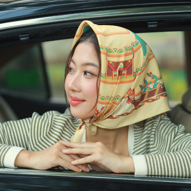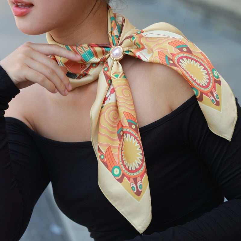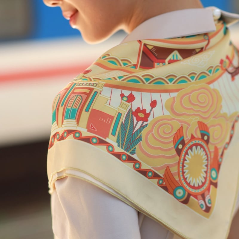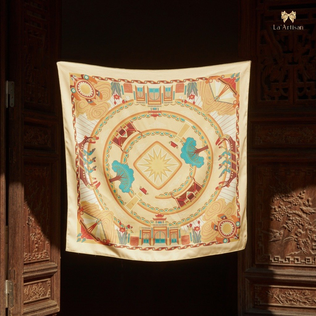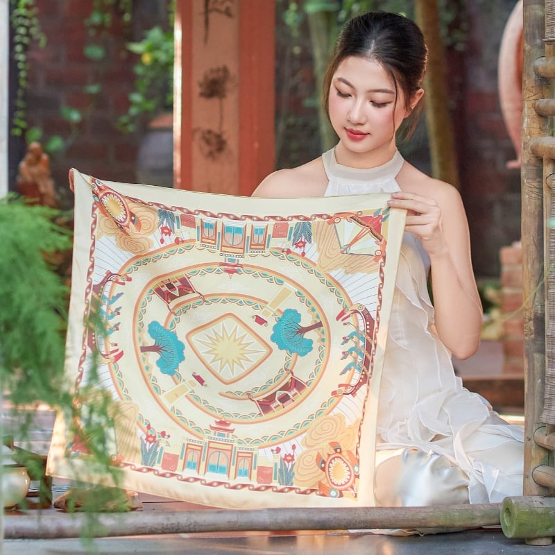 Nổi bật với tông vàng hoàng kim chủ đạo, khăn hoạ tiết Thành Cổ Loa gợi liên tưởng đến ánh hào quang cổ của một vương triều từng hưng thịnh. Chiếc khăn lụa cũng đồng thời được điểm xuyết bằng sắc xanh ngọc lam và đỏ son cổ – những gam màu vừa hoài niệm, vừa tạo độ tương phản tinh tế cho các họa tiết viền.