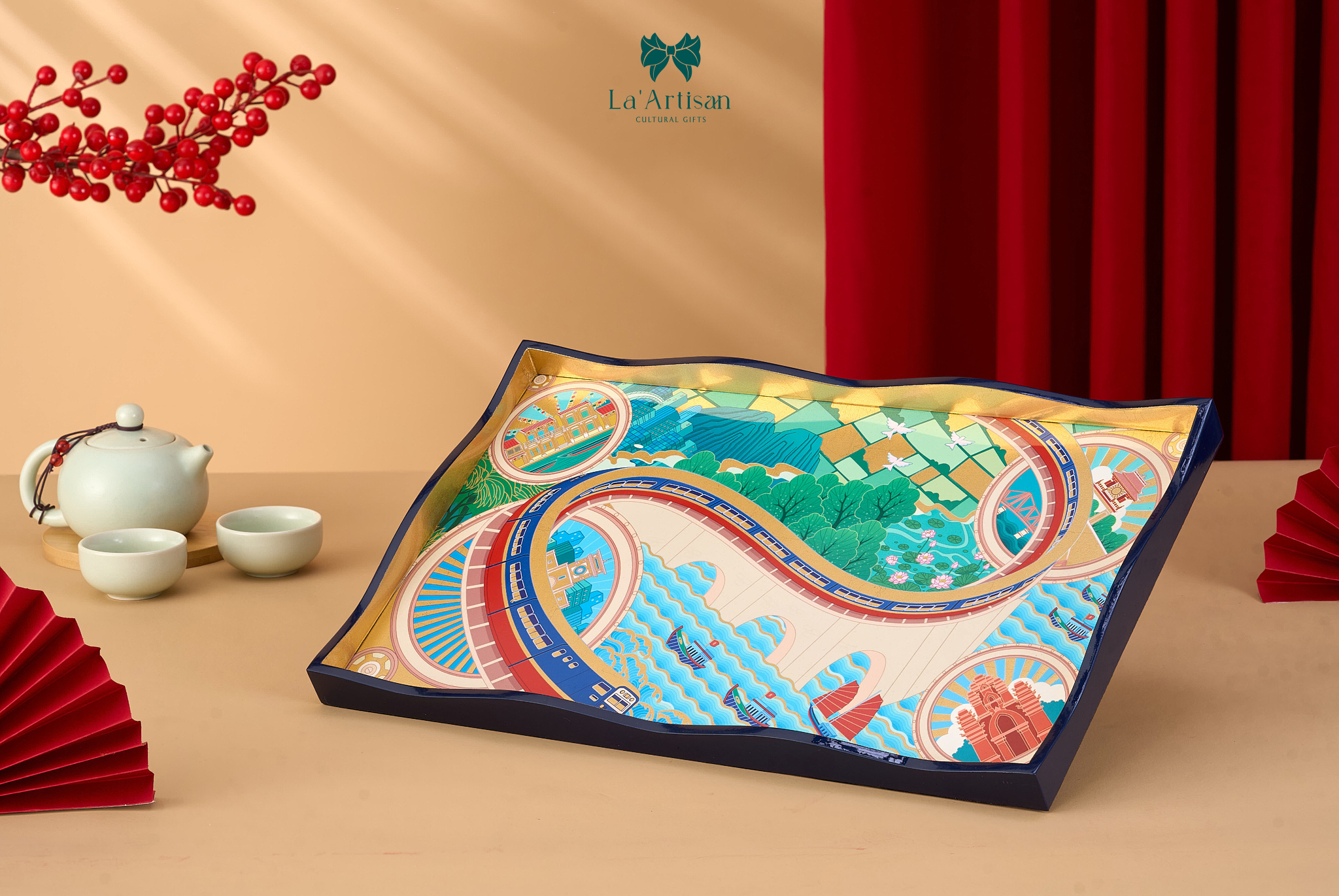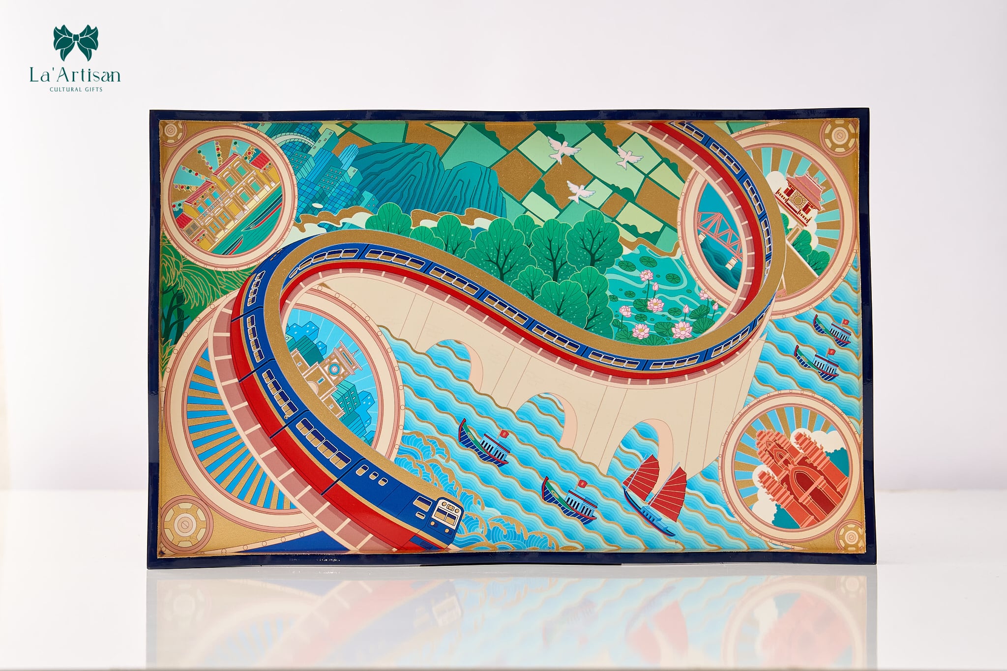 Từ tiếng còi tàu ngân vang giữa núi đồi đến những nhịp ray băng qua đồng bằng và biển cả, khay sơn mài Đường sắt Bắc Nam được thai nghén từ những ký ức chuyển động ấy. Lấy cảm hứng từ tuyến Đường sắt Bắc Nam dài khoảng 1.730 km – biểu tượng của sự kết nối và đoàn tụ – La’Artisan mang cả chiều dài đất nước vào trong từng lớp sơn mài thủ công, như một chuyến hành trình chở theo hoài niệm, tình thân và khát vọng thống nhất.