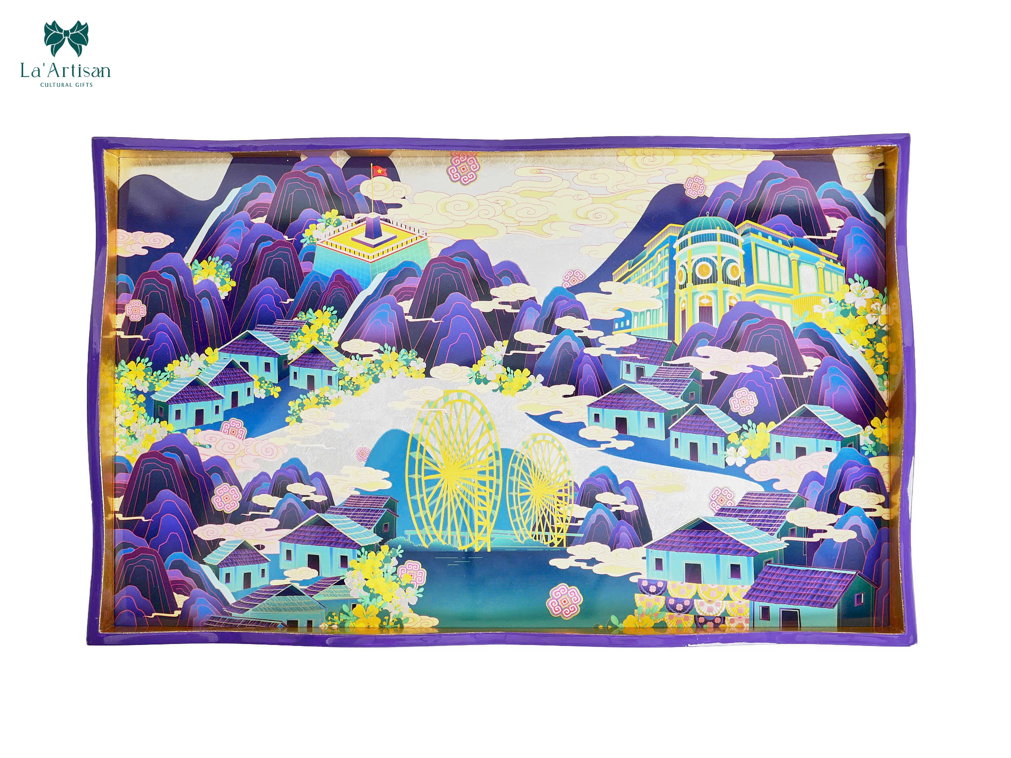 Lấy cảm hứng từ Sa Pa vùng đất nơi thiên nhiên kỳ ảo hòa cùng bản sắc văn hóa và “chữ tình” của con người miền núi. Nơi đỉnh Fansipan chạm mây, hoa đỗ quyên nở rực giữa màn sương và nhịp sống lặng lẽ mà đầy yêu thương. Tất cả đã được chắt lọc để tạo nên khay sơn mài Sa Pa một tác phẩm mang trọn hơi thở núi rừng và tình người Tây Bắc.