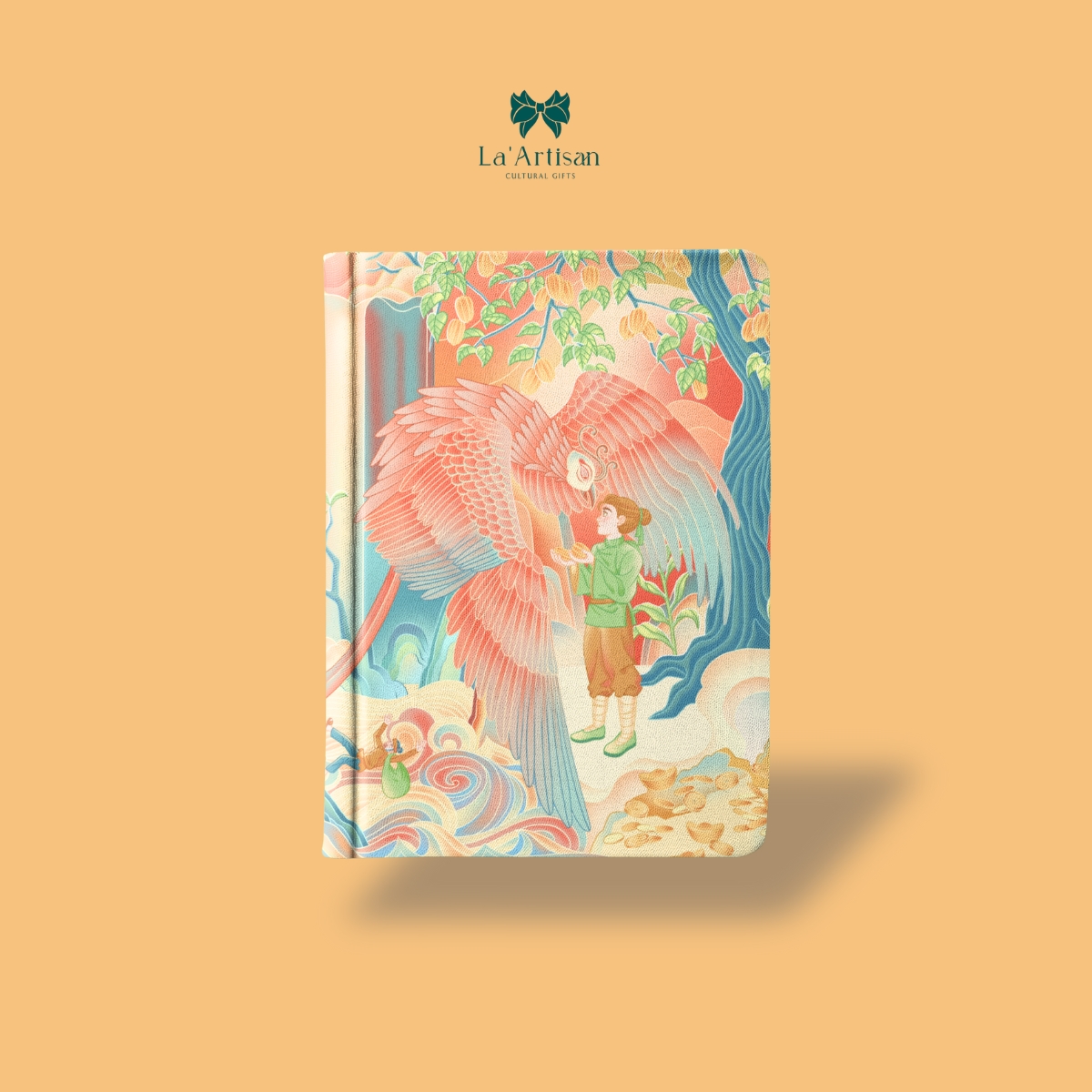 Trong tâm thức người Việt, truyện Ăn khế trả vàng không chỉ là một cổ tích luân lý, mà là một bài học về niềm tin, lòng hiếu đễ và sự thiện lương. La’Artisan đã chuyển thể tinh thần ấy vào chiếc sổ tay họa tiết Truyện Cây Khế bằng một ngôn ngữ giàu tính biểu tượng: chim thần sải cánh giữa tầng không, túi ba gang ẩn chứa những tham vọng của con người, và những nhánh khế vươn dài tỏa bóng mát như giấc mơ êm dịu của một thuở cổ tích.