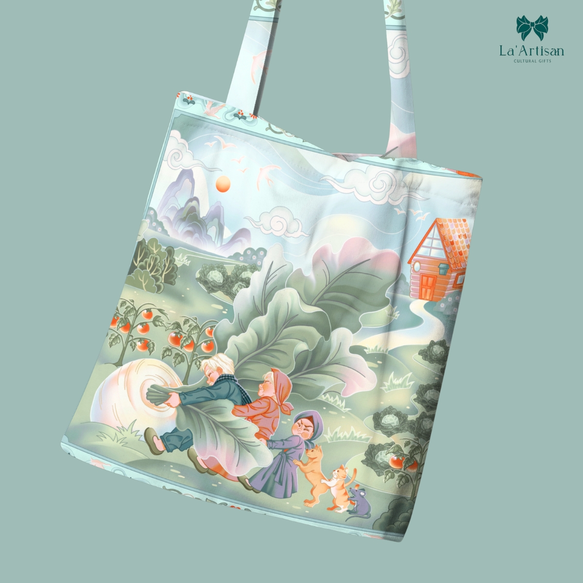 Trên nền túi tote, thiết kế tái hiện cảnh nhổ củ cải một cách sống động với bảng màu nhẹ nhàng kết hợp giữa pastel xanh lá, hồng đào và vàng ấm. Các chi tiết nhỏ như quả cà chua chín đỏ, mái nhà cổ tích và những cụm mây vờn quanh núi tạo nên một bố cục giàu chiều sâu thị giác. Sự chuyển sắc mềm mại của túi tote họa tiết Truyện Nhổ Củ Cải tạo hiệu ứng như tranh vẽ, trong đó từng nhân vật, từ cô cháu gái đến chú chuột nhỏ đều mang thần thái riêng biệt.